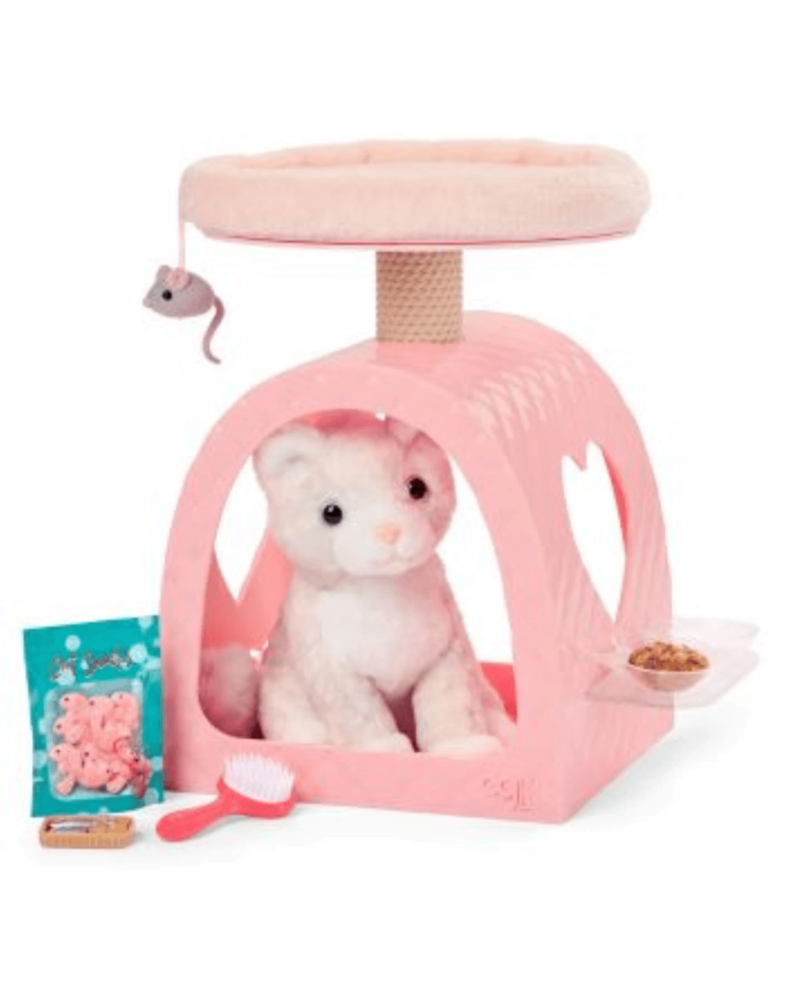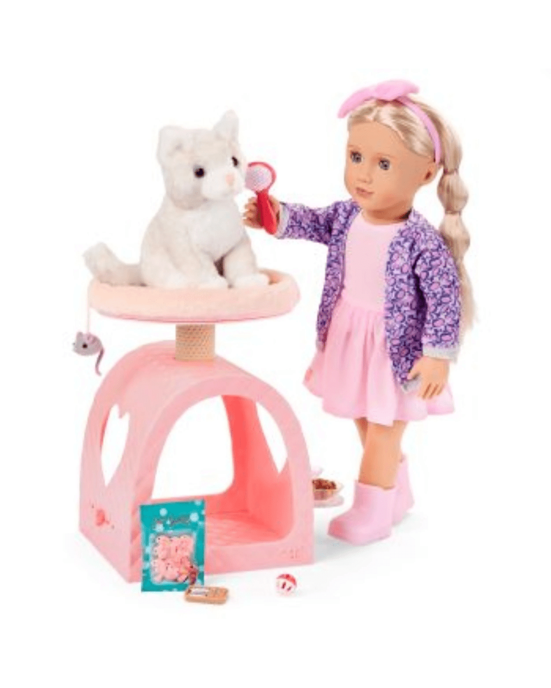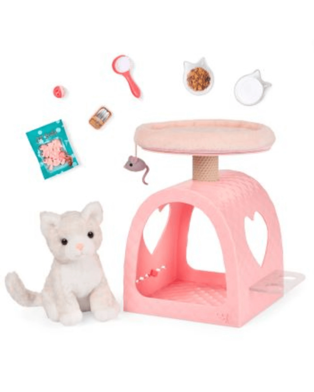 - 11-pc Cat House & Pet Kitty Set: Play, dream, and care for best furry friends with the Our Generation Purrfect Retreat set, including an adorable pet cat plush!