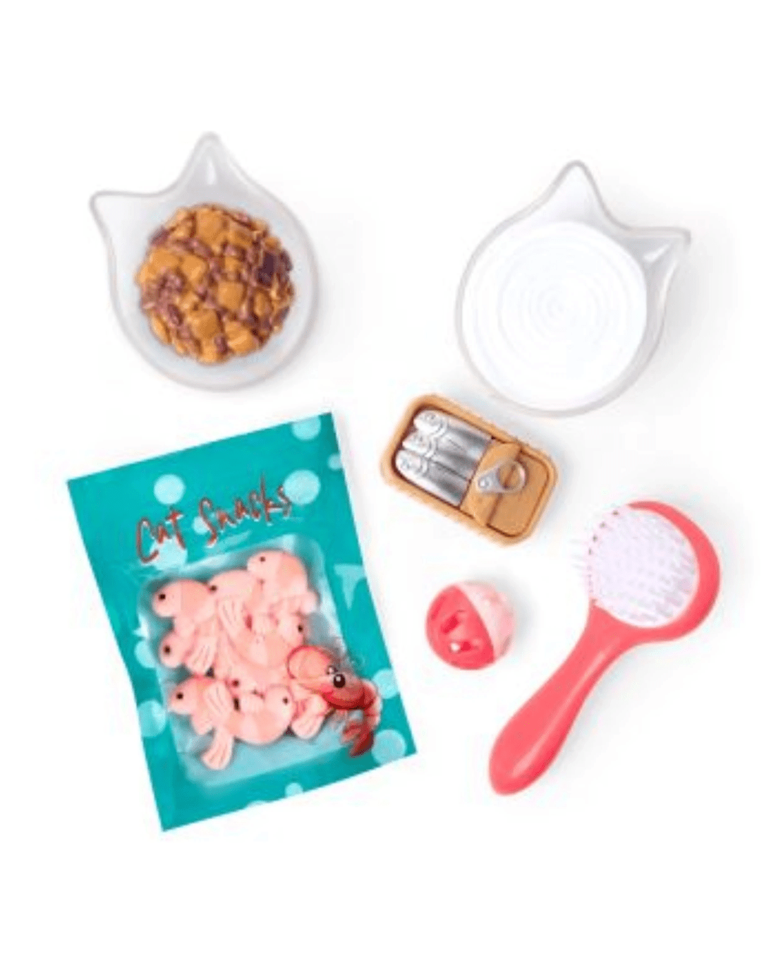 - Includes: Cat plush, cat bed with toy mouse, scratching post, cat dome, feeding shelf, milk bowl, food bowl, can of sardines, bag of snacks, grooming brush, and a ball.