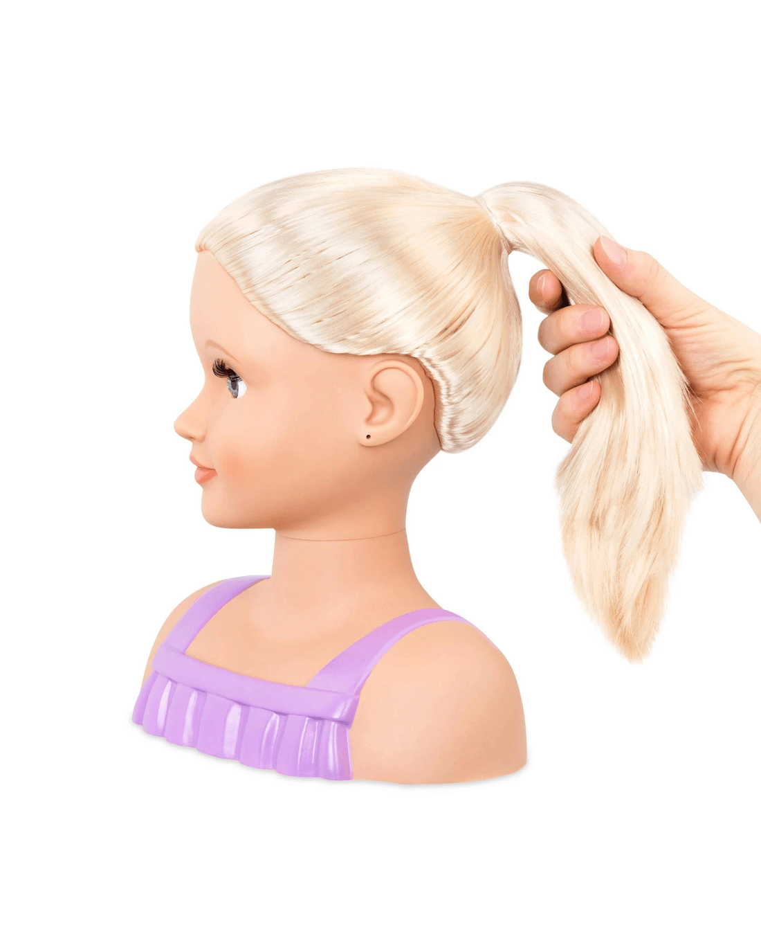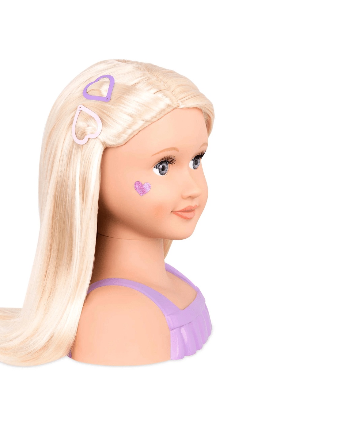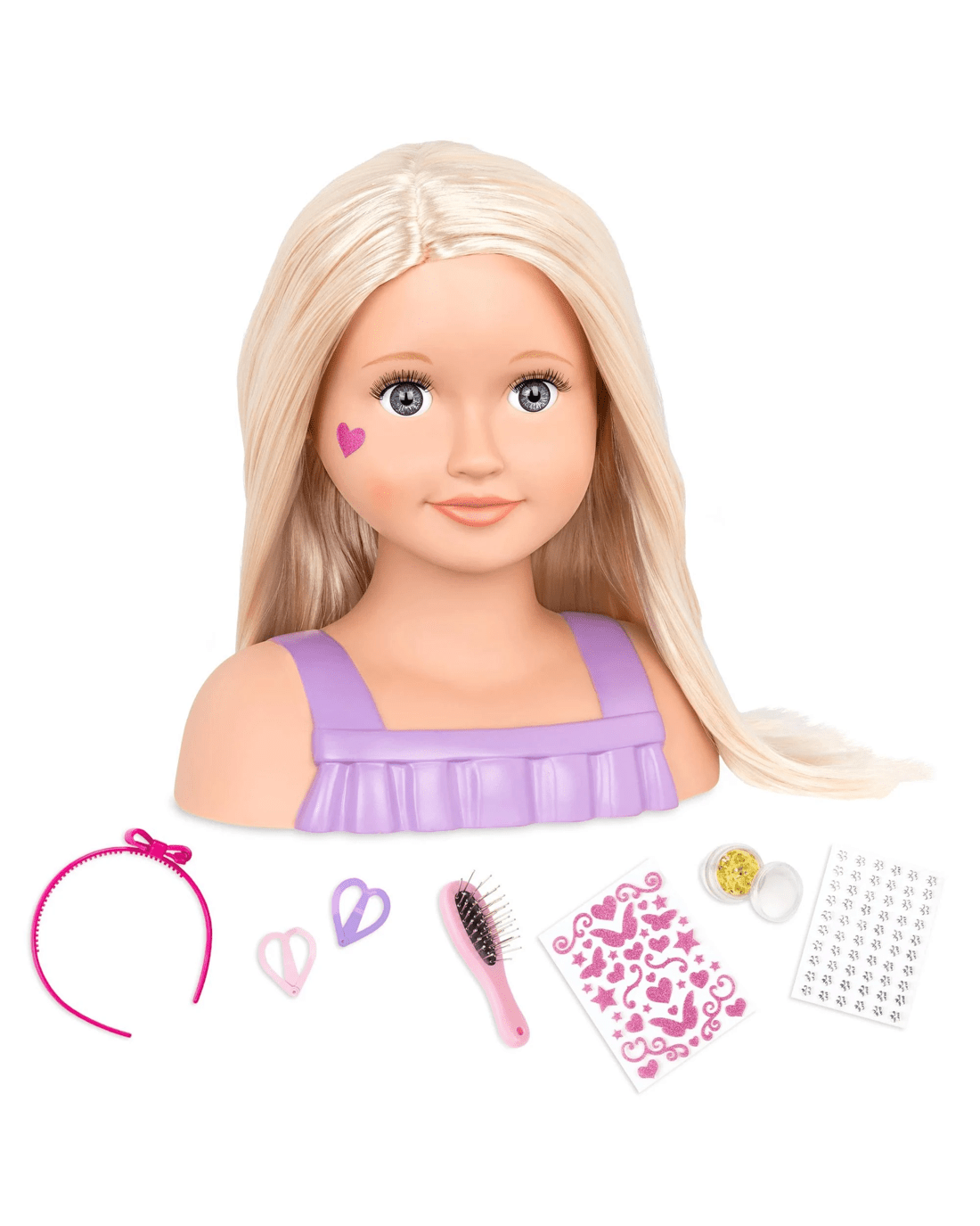 Bring a touch of magic to your playtime with the Our Generation Styling Head - Trista. Bursting with personality, Trista is ready for all your creative hairstyles, whether you fancy braids, curls, or something sparkling in between. With her beautiful, long, white-blonde hair and striking grey eyes, she’s the perfect companion for learning new styling techniques. Get hands-on with the included hair accessories, from colourful clips to playful bows, then add a dash of shimmer with sparkling stickers. The easy-to-follow styling booklet will inspire you to create countless fabulous looks. Whether you’re just starting out or already love experimenting with hairstyles, Trista is the perfect way to boost your styling skills and confidence. Let your imagination run wild and make every play day a glamorous experience – Trista can’t wait to see your next masterpiece!