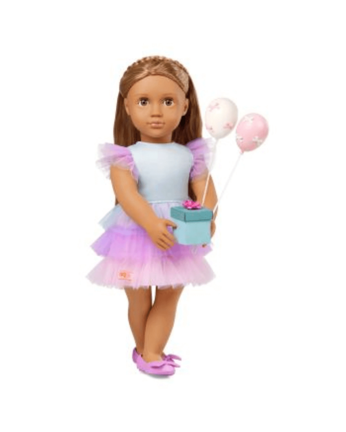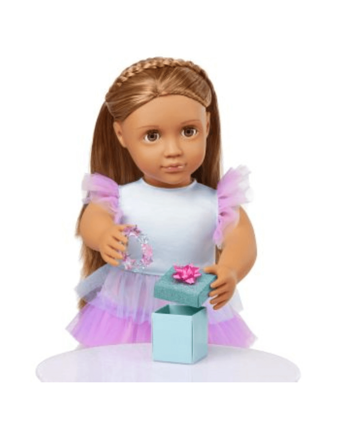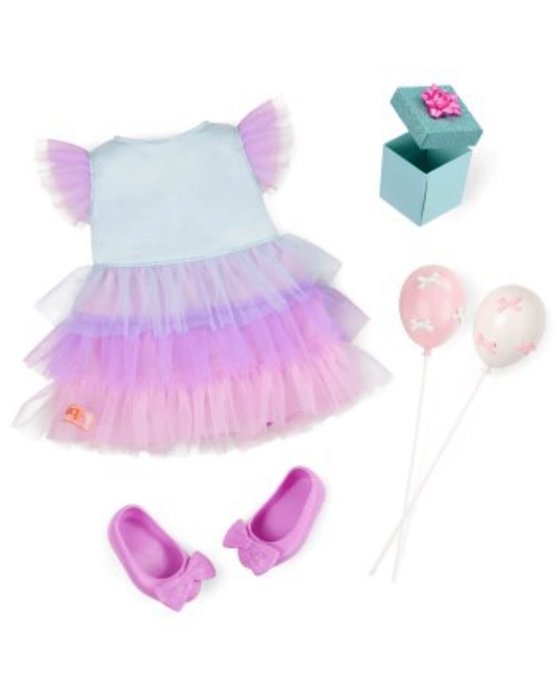 Make every playtime a special occasion with the Our Generation Surprise Party Outfit. Featuring a sparkling dress and charming bow-accented shoes, this set transforms your 18-inch dolls into the star of any celebration. Kids can experience the excitement of unveiling a surprise with the included gift box, which opens to reveal a glittery bracelet, adding even more delight to imaginative scenarios. With themed balloons and festive accessories, little ones are inspired to create joyful party adventures and share laughter with friends. Designed for easy dressing, this outfit encourages creativity and unique storytelling. Surprise your child and let their dolls shine—get ready for endless party moments.Features