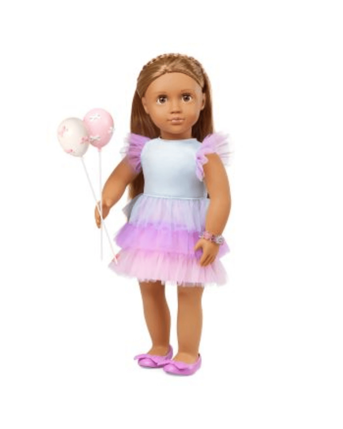 - Child-Friendly Design: Includes a party dress with radiant ruffles, a pair of shoes accented with cute bows on the toes, 2 party balloons, and a surprise gift box with a mystery item inside.
