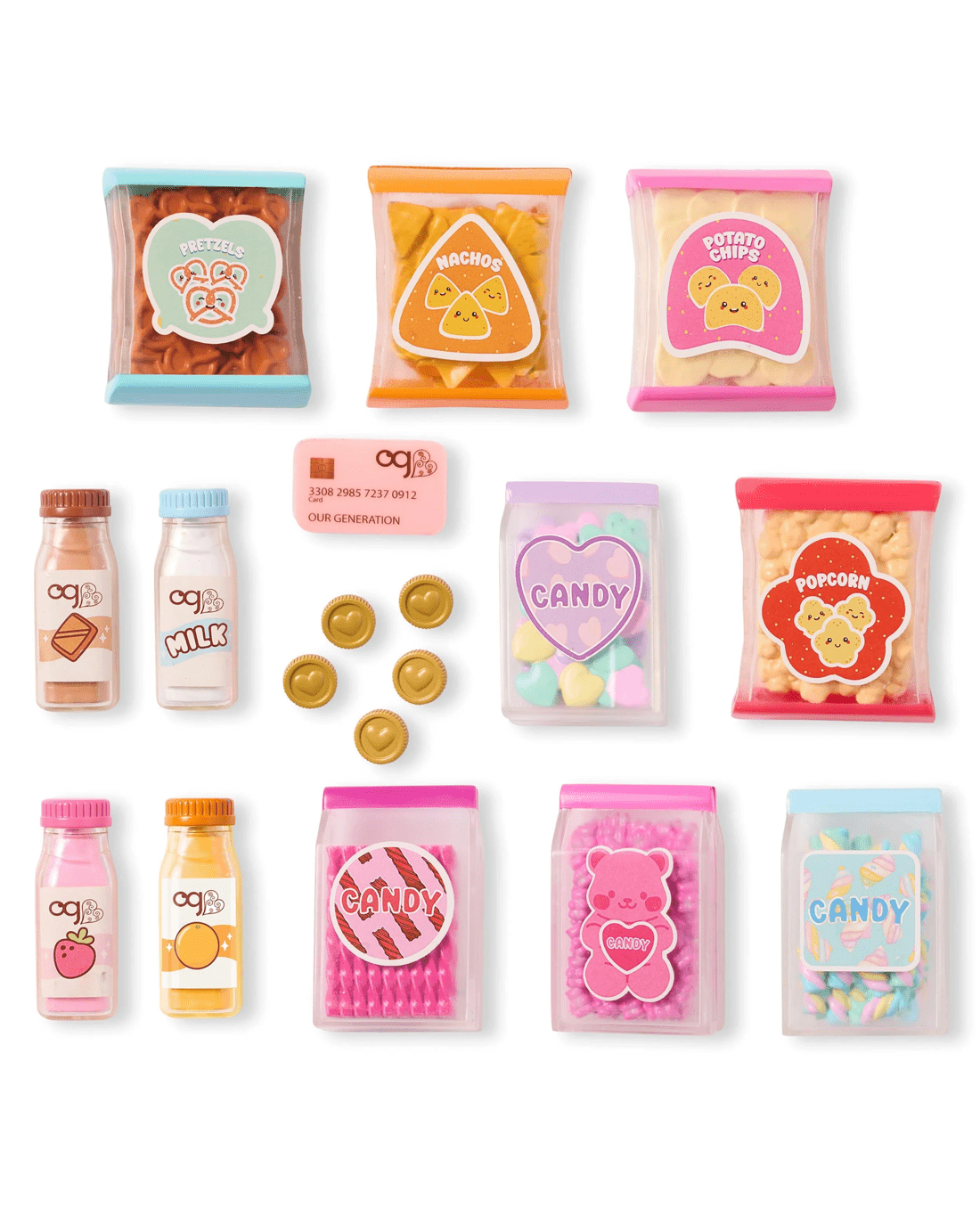 - Includes 1 x toy vending machine, 5 x play coins, 1 x pretend credit card, 4 x candy bag varieties, 1 x bag of popcorn, 1 x bag of pretzels, 1 x bag of nachos, 1 x bag of chips, 3 x milk bottles and 1 x orange juice