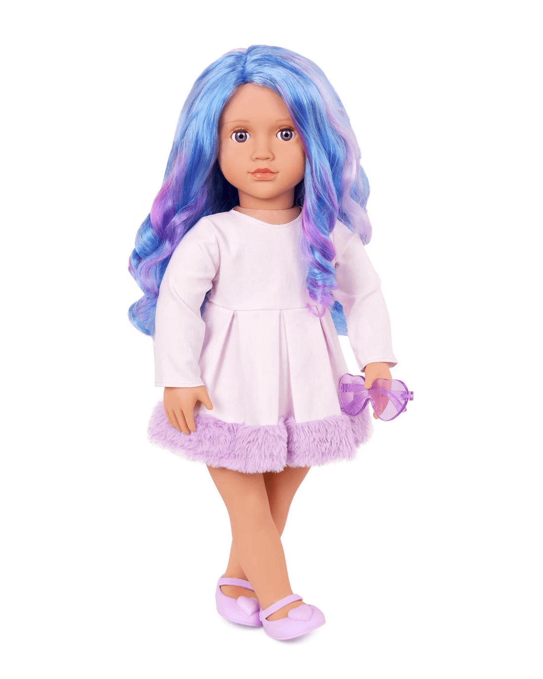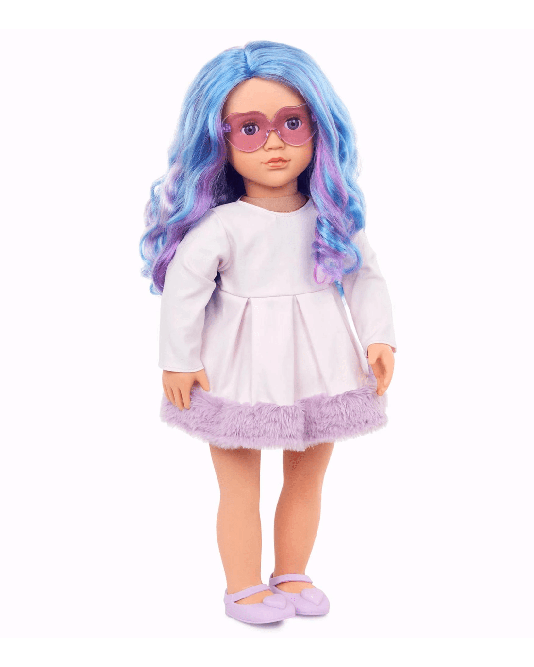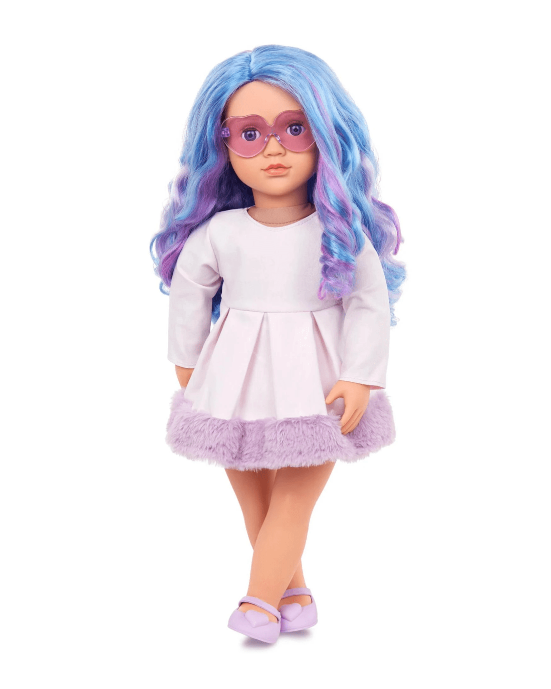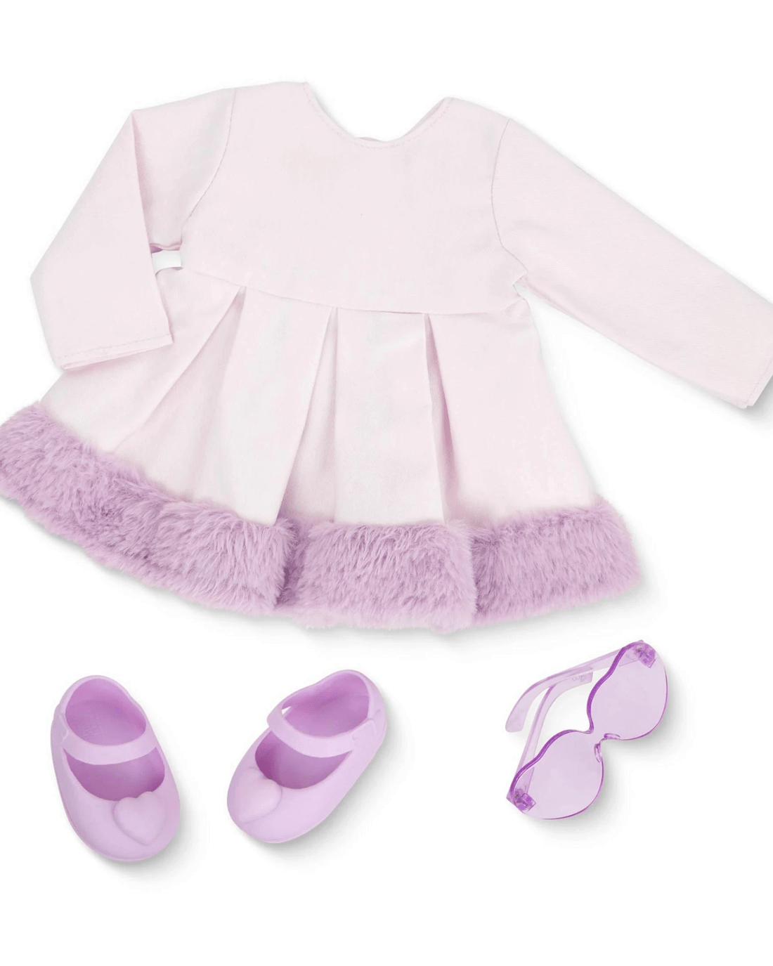 - Includes: doll, long-sleeved dress with a pretty faux-fur trim, purple heart-shaped glasses, a pair of undies, and shoes.
