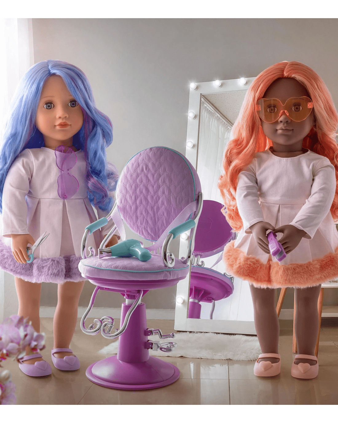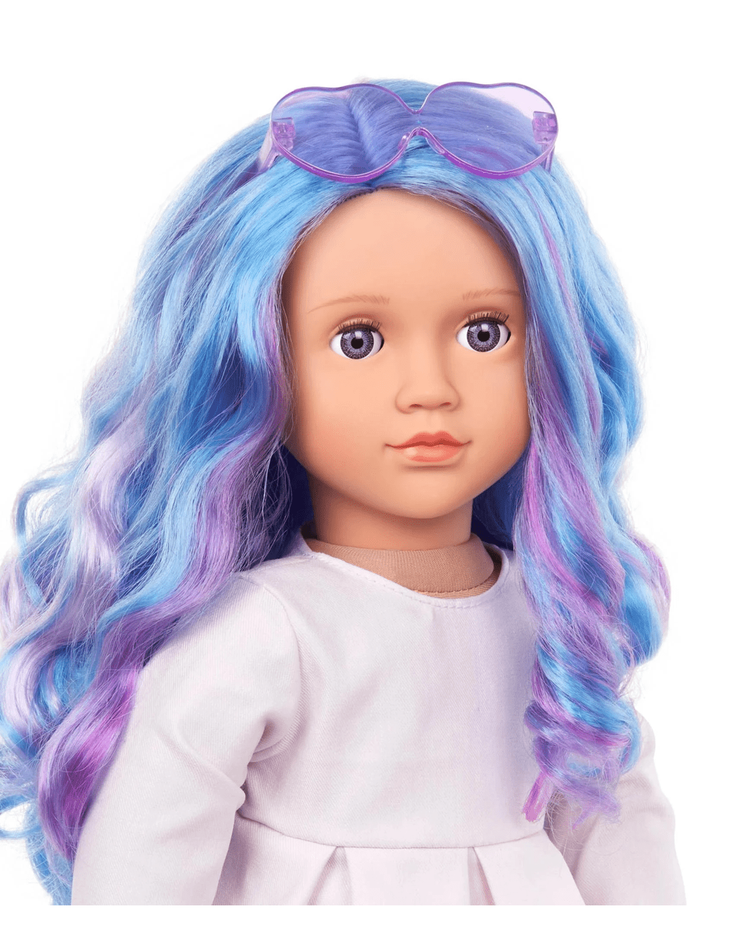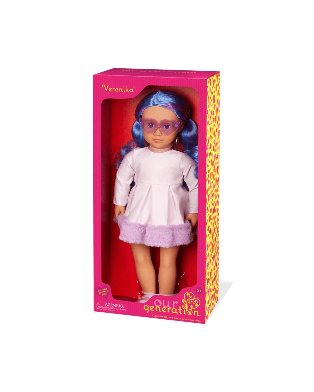 Meet Veronika, the Our Generation fashion doll who loves to stand out, not just with her bold blue hair and fun ultra-violet streaks, but with her sparkling personality too. Her sparkling blue eyes open and close, and her huggable body is perfect for taking on countless adventures together. Dressing her up is simple thanks to her easy-to-change outfits, and her beautifully styled hair is ready for creative looks from ponytails to braids. Veronika arrives wearing a trendy dress trimmed with faux fur, adorable heart-shaped sunglasses, and cute shoes to match her unique flair. She’s ready to inspire your little one to imagine, play, and express themselves in style. Add Veronika to your collection and let the friendship stories begin!