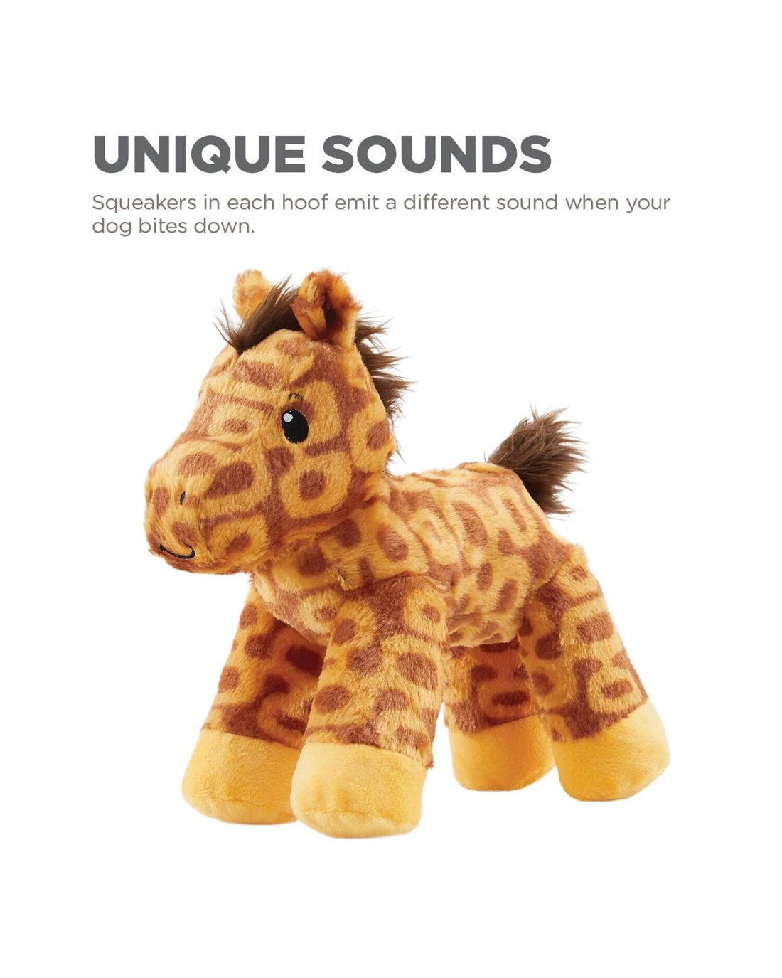 - Giraffe plush dog toy featuring 4 different noisemakers and squeakers in the hooves for quadruple the noisy fun