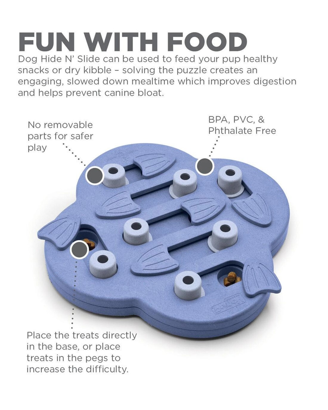 • NON-REMOVABLE PARTS & DURABLE COMPOSITE WOOD DESIGN: Made with a non-slip base and a unique plastic and wood composite, the Dog Hide N' Slide is a game that is built to last for hours and hours of fun! Train your pup not to chew on the toy by removing it after the treats have been eaten. Non-removable parts make it a safe and easy to clean choice