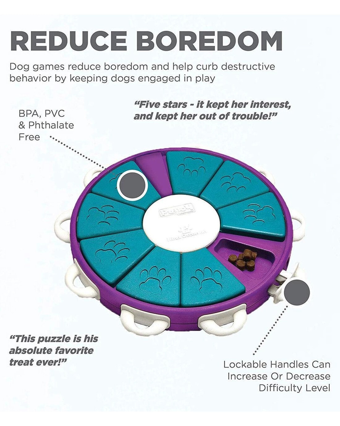 • BPA, PVC & PHTHALATE-FREE: Nina Ottosson by Outward Hound interactive treat dog puzzles are designed with your pet's health in mind from food safe materials that you can trust with your dog. Easy to clean with warm water and soap between uses