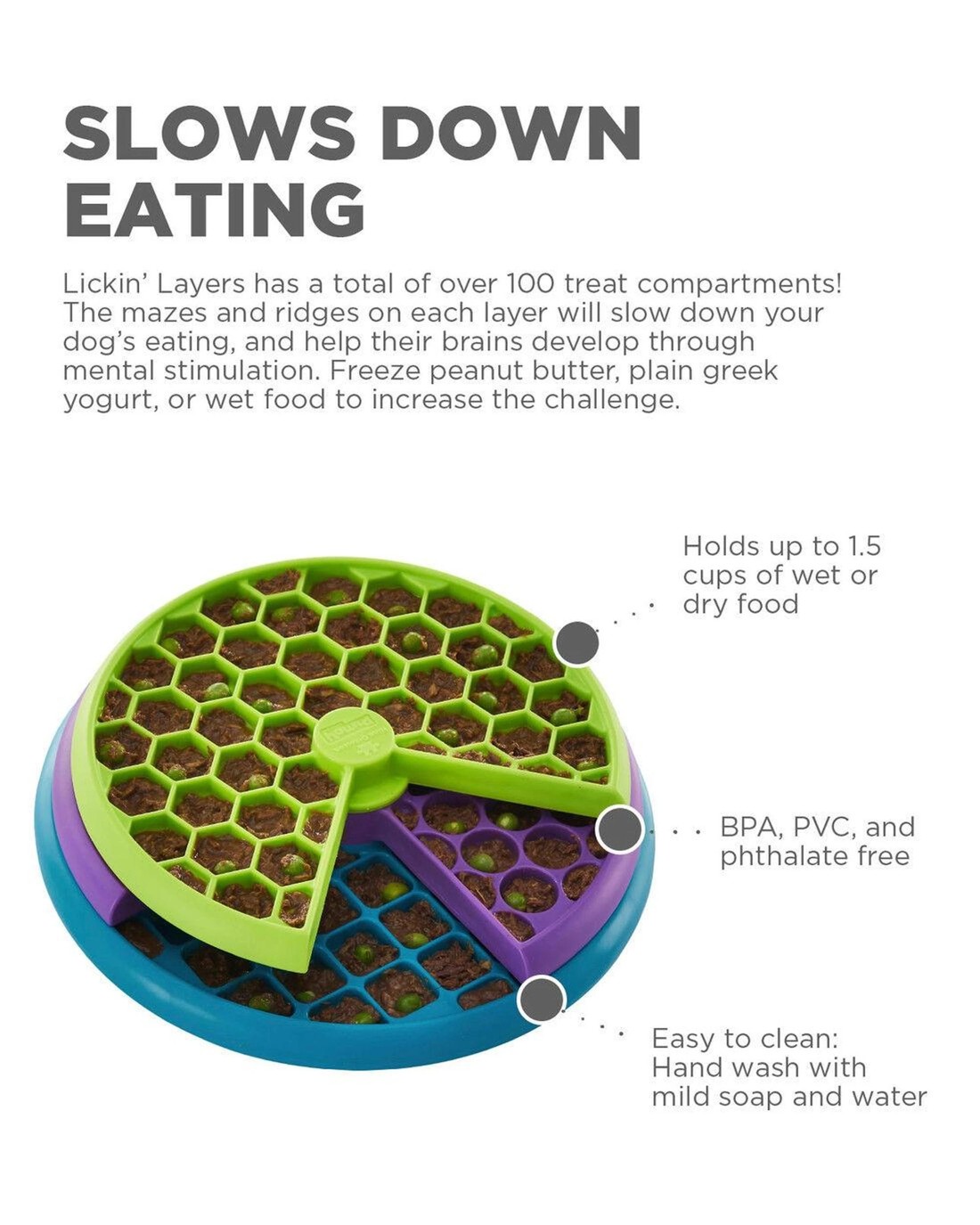 - IMPROVES DIGESTION: Use as a slow feeder! The mazes on ridges on each layer force your dog to eat at a safer, healthier pace