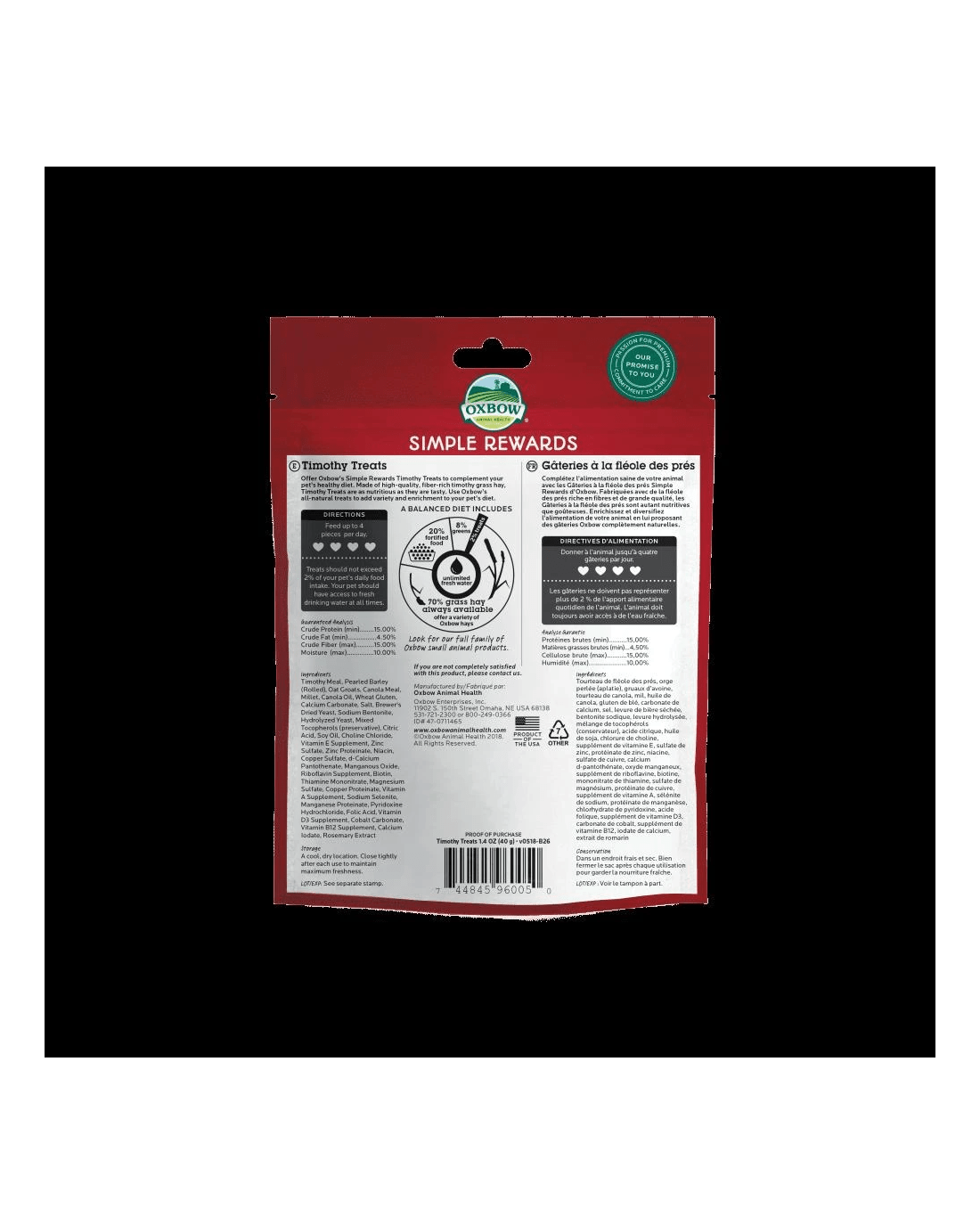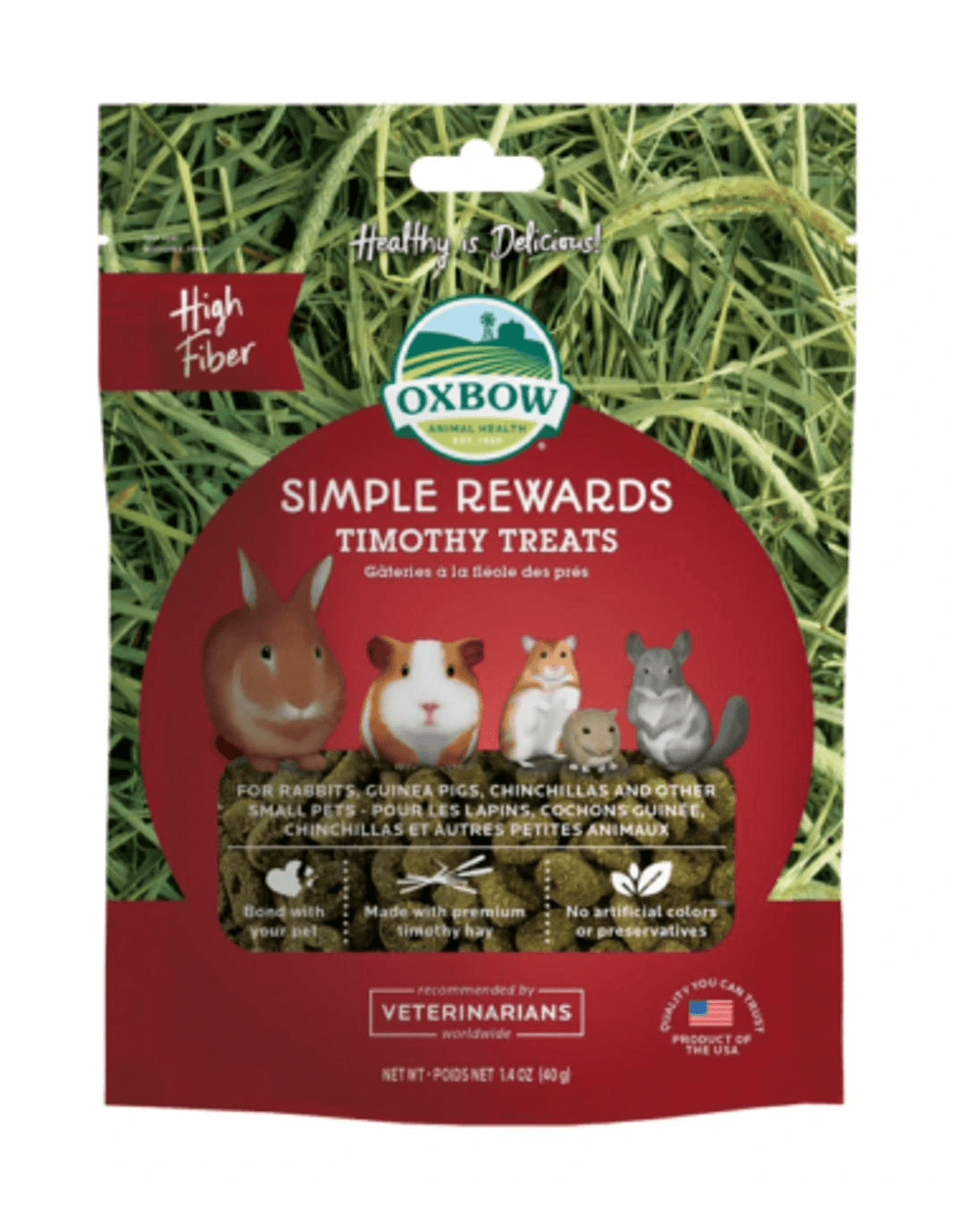 Oxbow Simple Rewards Timothy Treats 40g are oven-baked small animal treats made with real, wholesome ingredients. Offer sparingly as a training reward or enrichment alongside a diet of unlimited grass hay and a measured daily pellet. 40g.