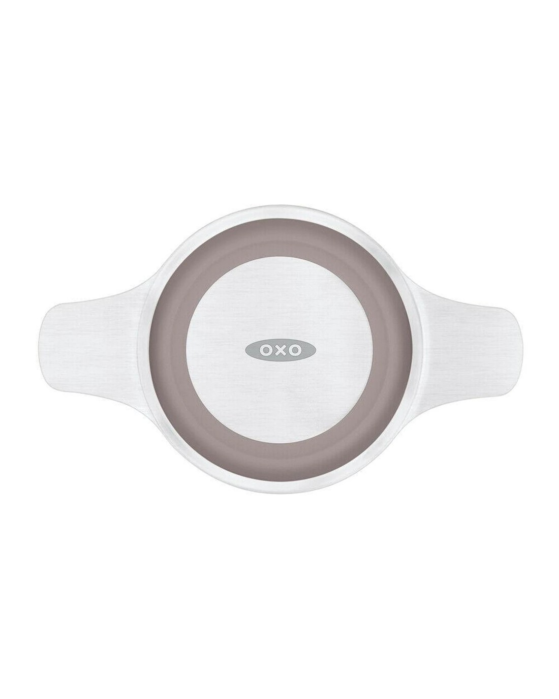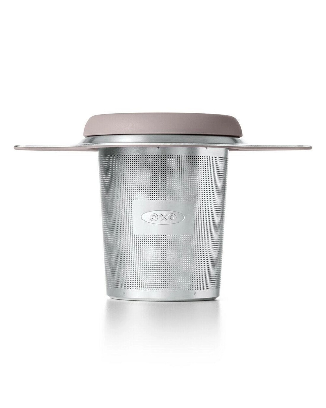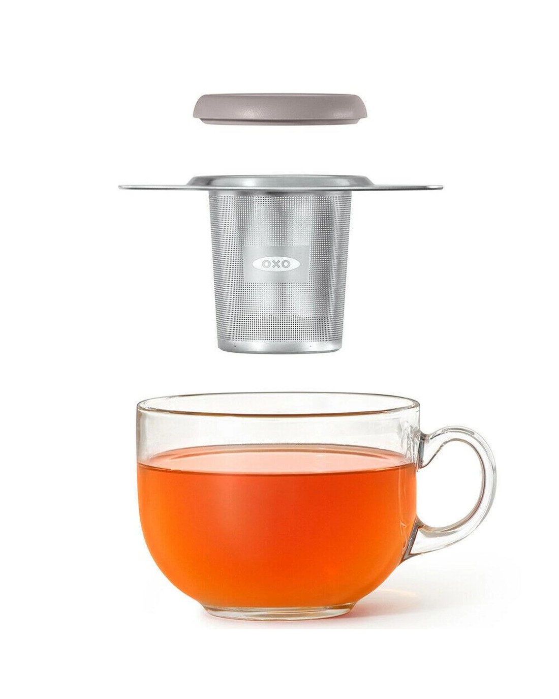 The OXO Brew Tea Infuser Basket optimizes the flavor of your favorite loose leaf teas. Make the most of your favorite loose leaf tea with the OXO Tea Infuser Basket. The large-capacity stainless steel basket is calibrated for maximum flavor extraction and shaped to sit nicely in your mug. The etched hole pattern keeps even the tiniest tea particles contained, while the dual-function lid retains heat and doubles as a drip tray to reduce mess. Stay-cool silicone touchpoints ensure the entire brewing experience is a ritual you savor.