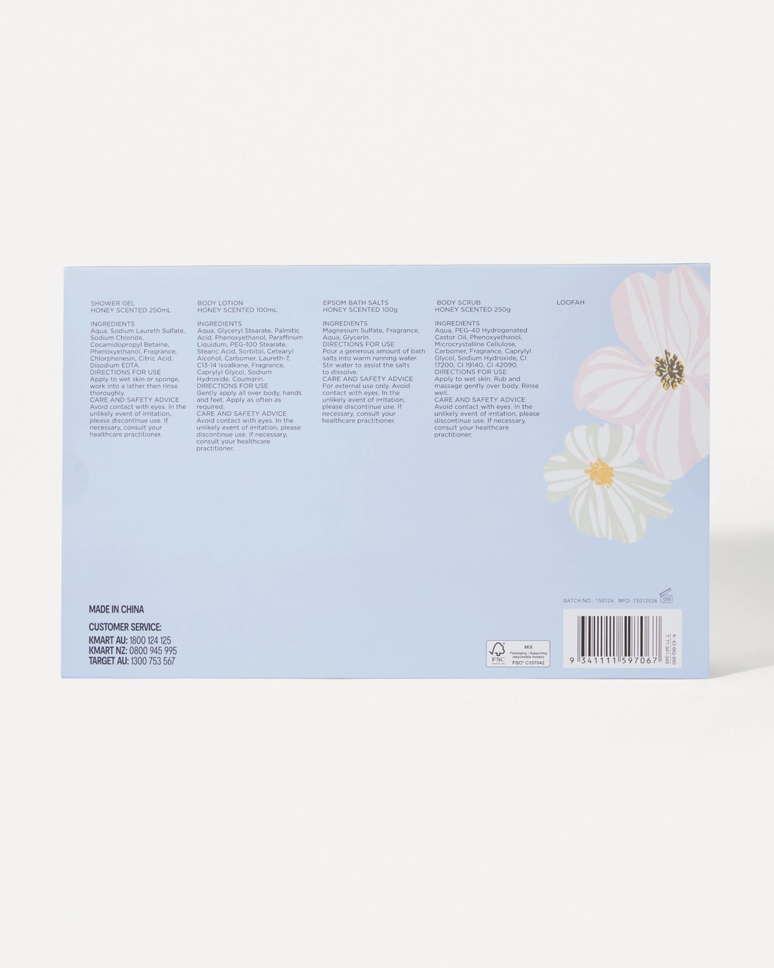 • Includes 1 x shower gel, 1 x body lotion, 1 x Epsom bath salts, 1 x body scrub and 1 x loofah