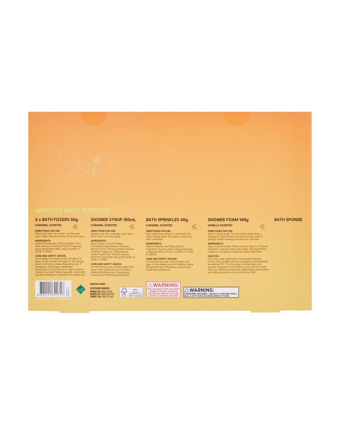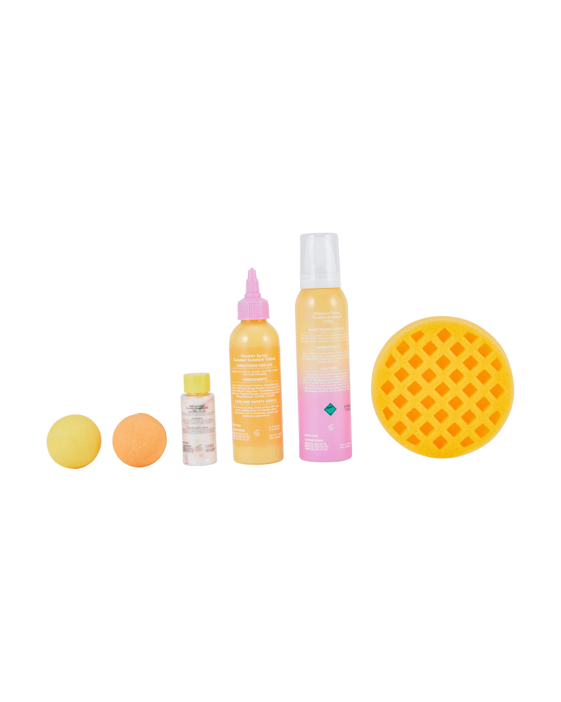 - Includes 2 x bath fizzers, 1 x shower syrup, 1 x bath sprinkles, 1 x shower foam and 1 x bath sponge