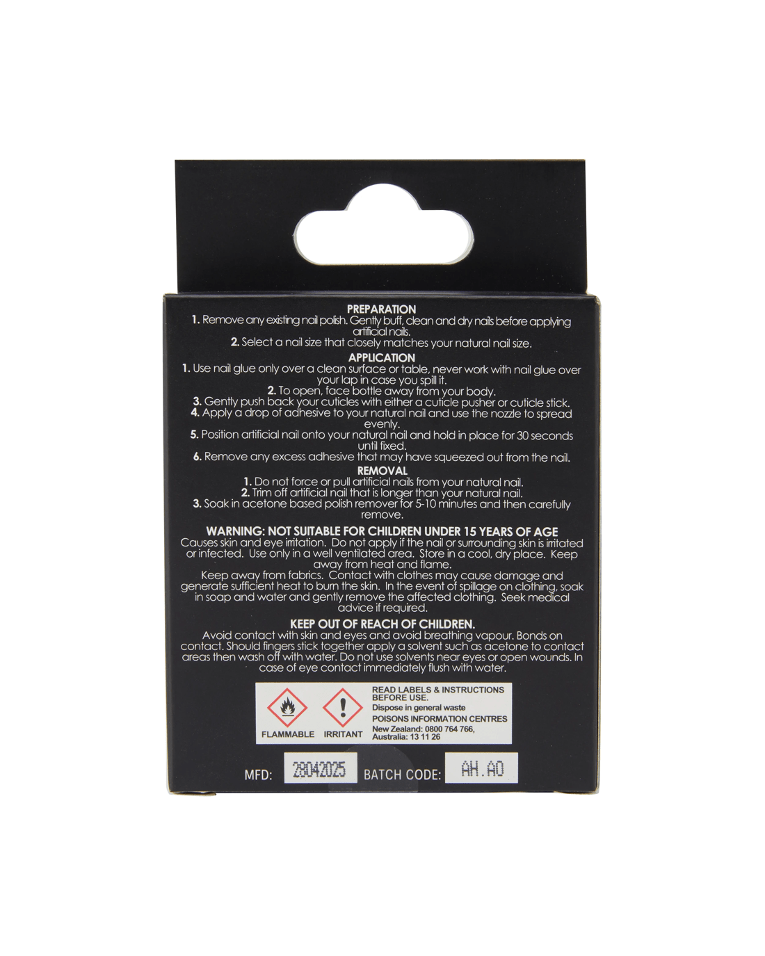• Nail glue: Ethyl Cyanoacrylate, Polymethyl Methacrylate, Tris-BHT Mesitylene, Acetyl Tributyl Citrate, Tocopherol and Panthenol