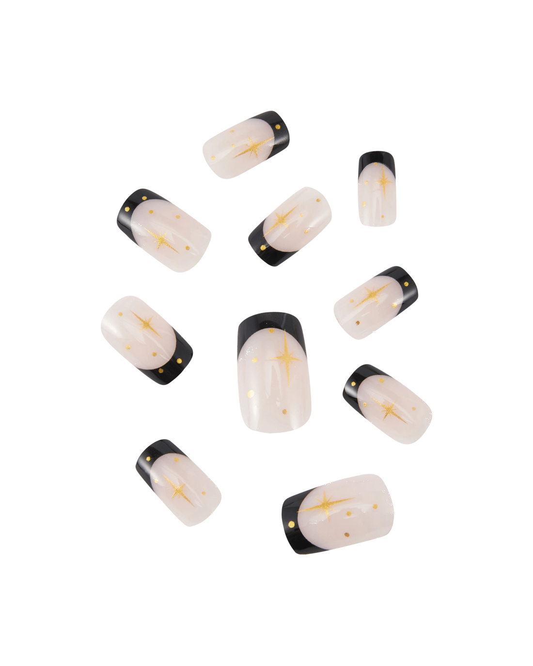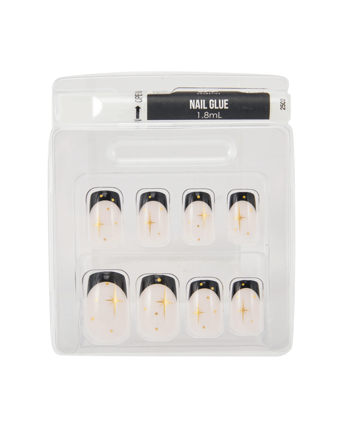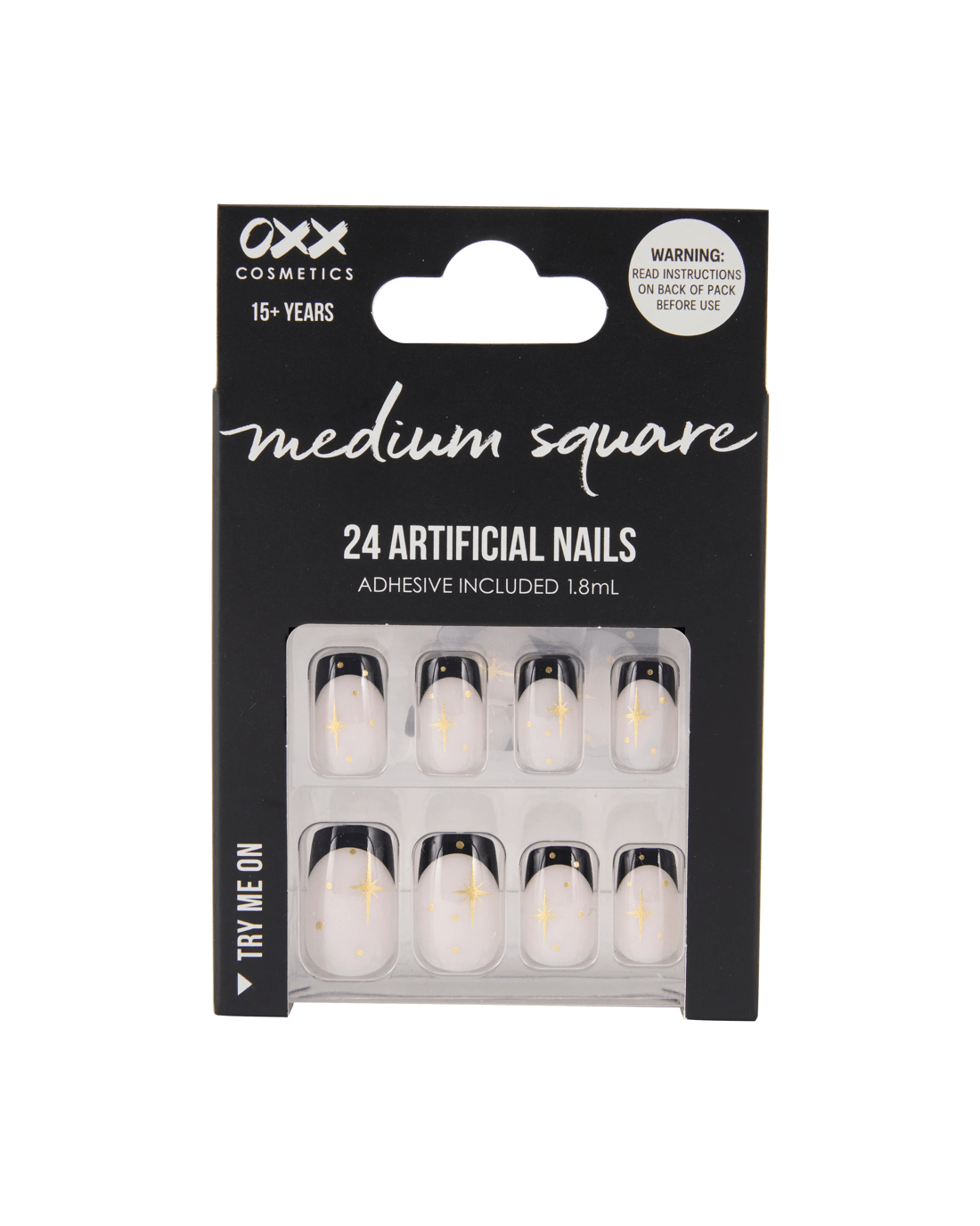 OXX Cosmetics 24 Pack Artificial Nails with Adhesive - Medium Square Shape, Black French Tip with Stars