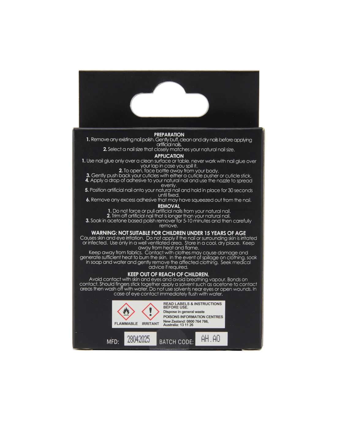 • Nail glue: Ethyl Cyanoacrylate, Polymethyl Methacrylate, Tris-BHT Mesitylene, Acetyl Tributyl Citrate, Tocopherol and Panthenol
