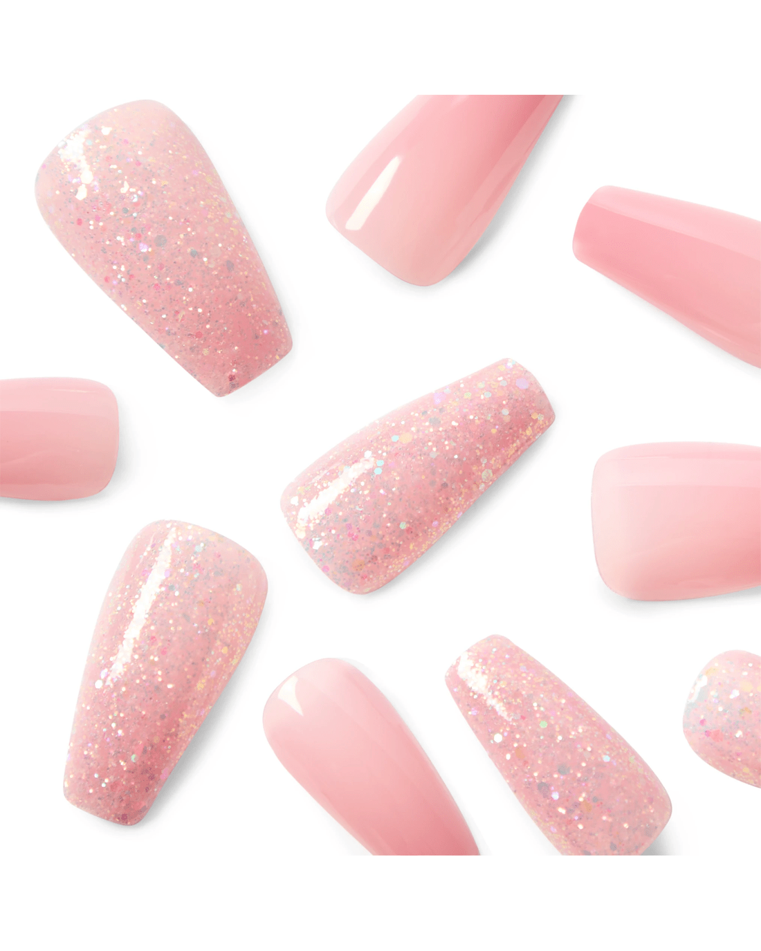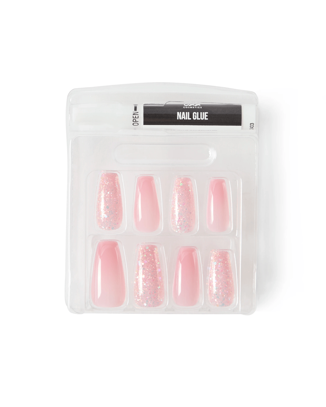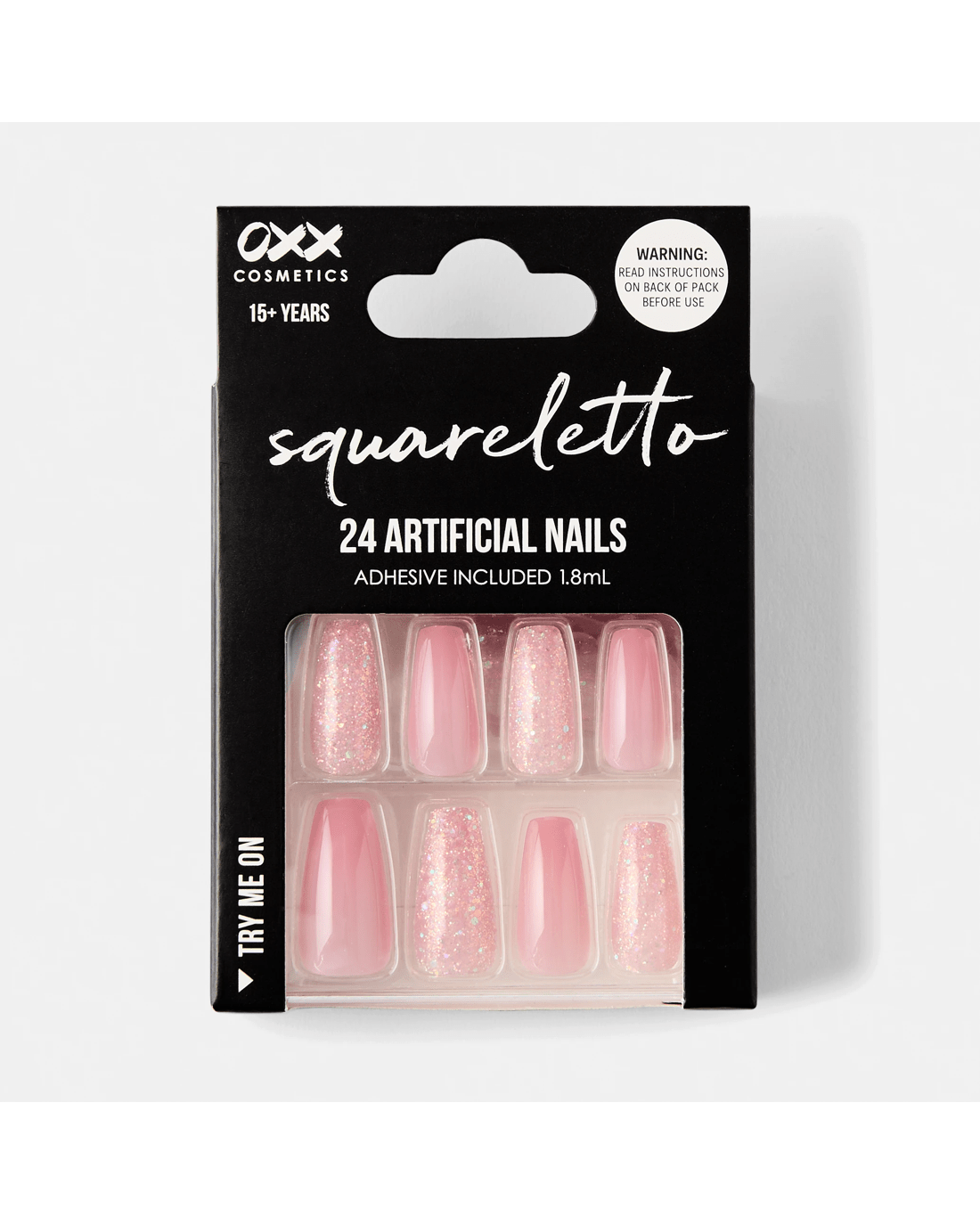 OXX Cosmetics 24 Pack Artificial Nails with Adhesive - Squareletto Shape, Pink Glitter