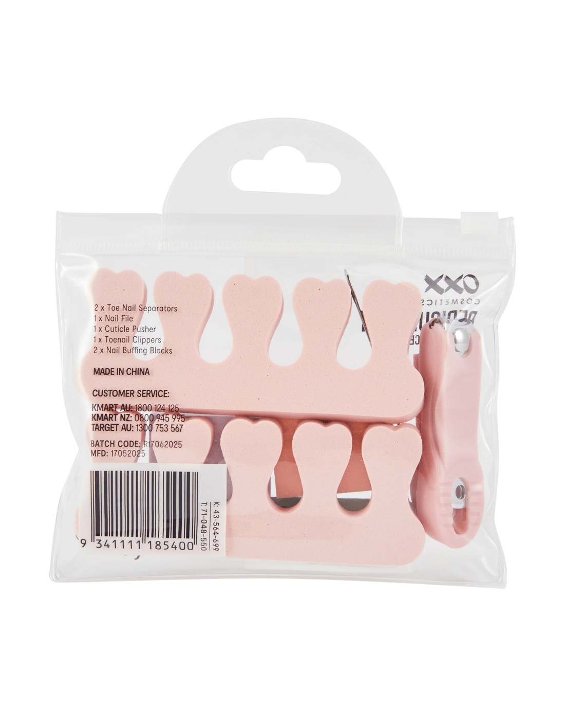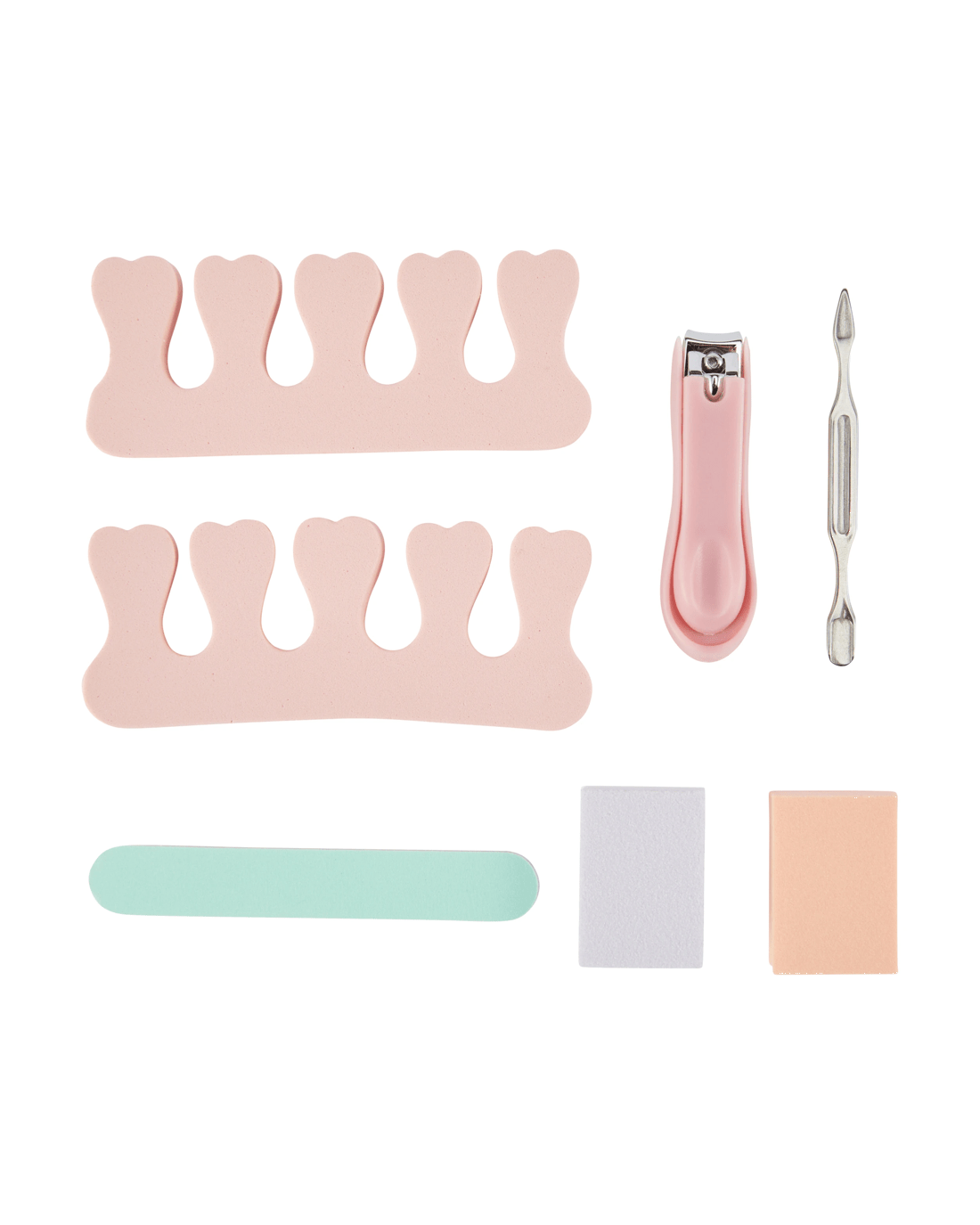 • Includes 2 x toe nail separators, 1 x nail file, 1 x cuticle pusher, 1 x toenail clippers, 2 x nail buffing blocks