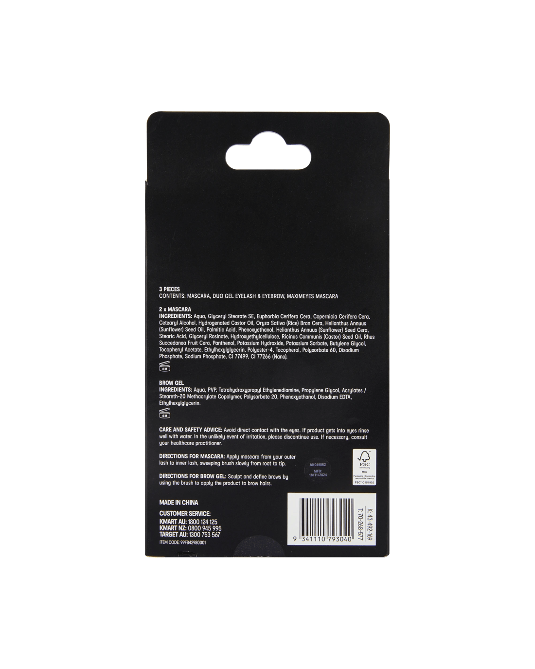 • Includes 1 x mascara, 1 x duo gel eyelash and eyebrow and 1 x Maximeyes mascara