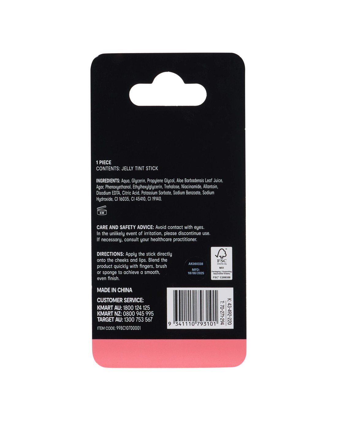 • Ingredients: Aqua, Glycerin, Propylene Glycol, Aloe Barbadensis Leaf Juice, Agar, Phenoxyethanol, Ethylhexylglycerin, Trehalose, Niacinamide, Allantoin, Disodium EDTA, Citric Acid, Potassium Sorbate, Sodium Benzoate, Sodium Hydroxide, CI 16035, CI 45410 and CI 19140