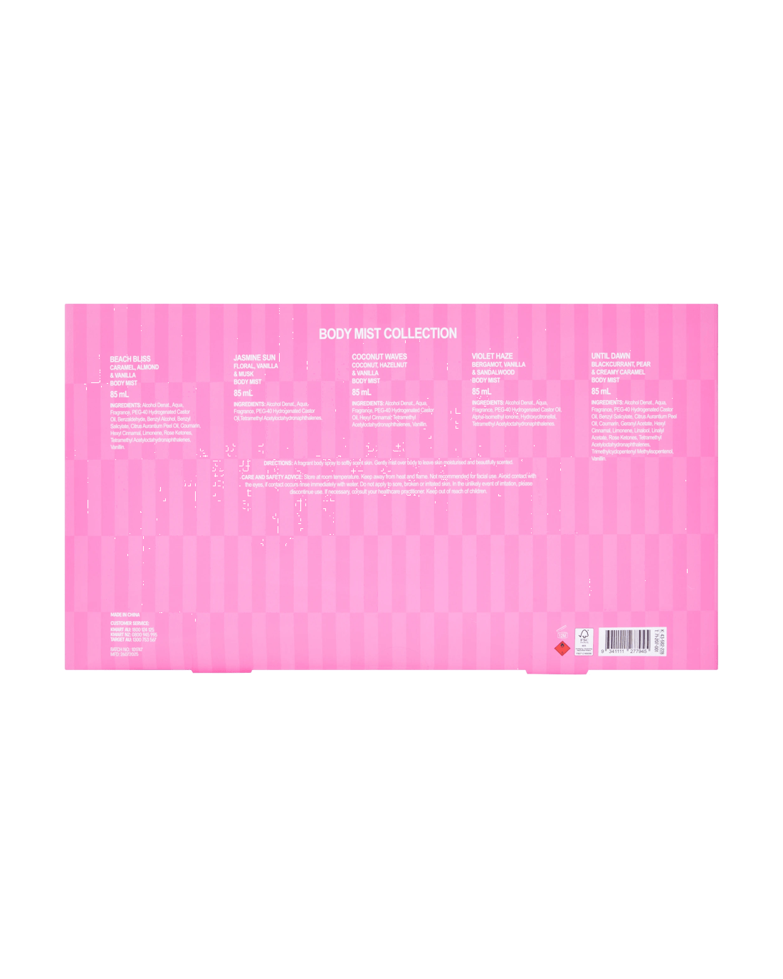 - Beach Bliss Body Mist: Alcohol Denat., Aqua, Fragrance, PEG-40 Hydrogenated Castor Oil, Benzaldehyde, Benzyl Alcohol, Benzyl Salicylate, Citrus Aurantium Peel Oil, Coumarin, Hexyl Cinnamal, Limonene, Rose Ketones, Tetramethyl Acetyloctahydronaphthalenes, Vanillin