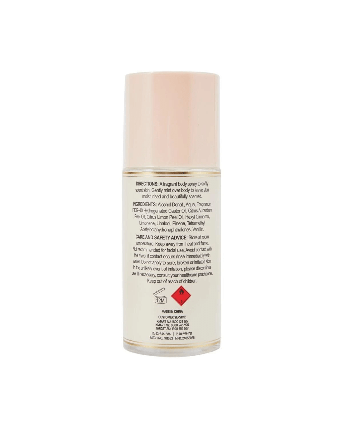- Body mist: Alcohol Denat., Aqua, Fragrance, PEG-40 Hydrogenated Castor Oil, Citrus Aurantium Peel Oil, Citrus Limon Peel Oil, Hexyl Cinnamal, Limonene, Linalool, Pinene, Tetramethyl Acetyloctahydronaphthalenes, Vanillin