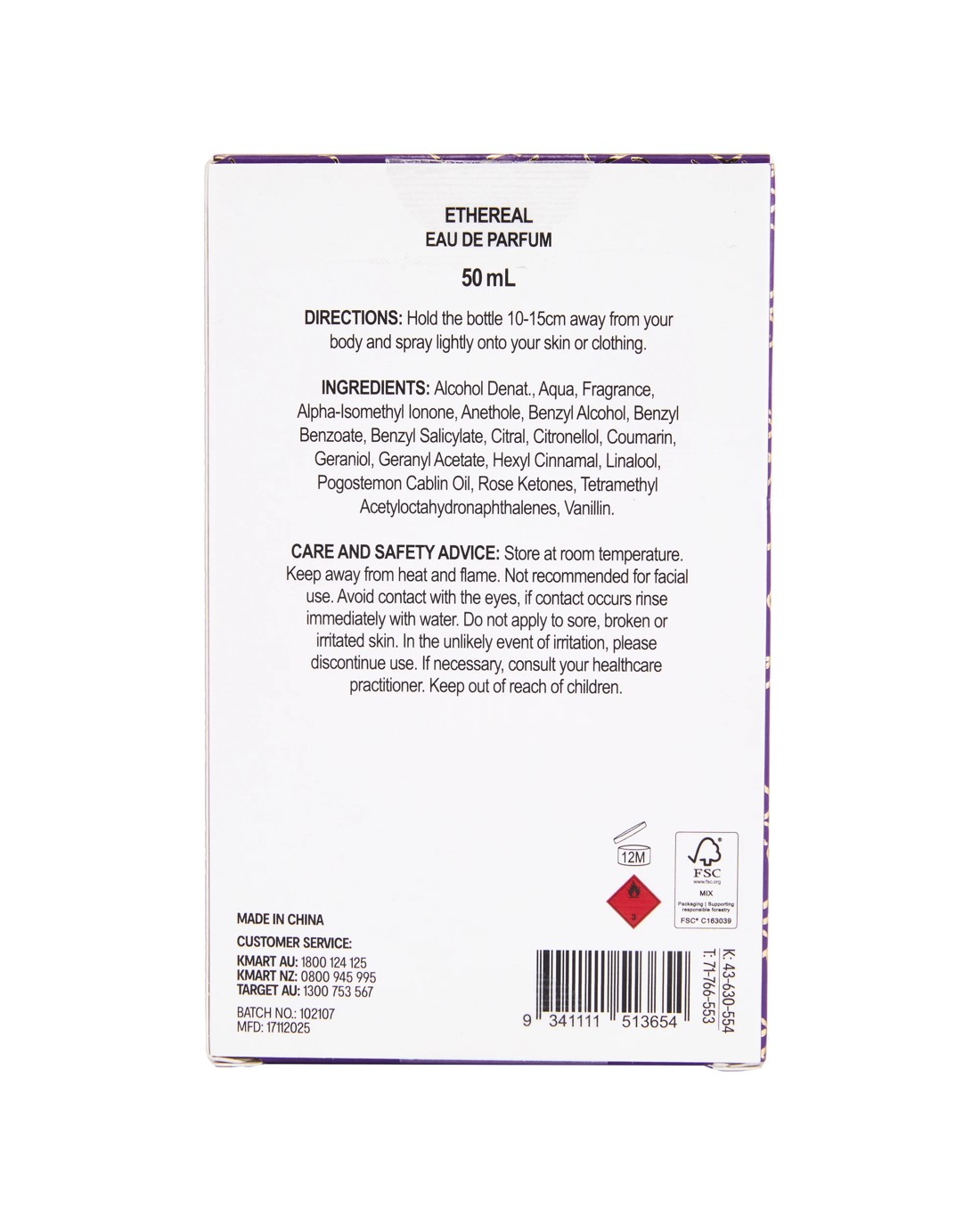 - Ingredients: Alcohol Denat., Aqua, Fragrance,Alpha-Isomethyl Ionone, Anethole, Benzyl Alcohol, Benzyl Benzoate, Benzyl Salicylate, Citral, Citronellol, Coumarin, Geraniol, Geranyl Acetate, Hexyl Cinnamal, Linalool, Pogostemon Cablin Oil, Rose Ketones, Tetramethyl Acetyloctahydronaphthalenes, Vanillin