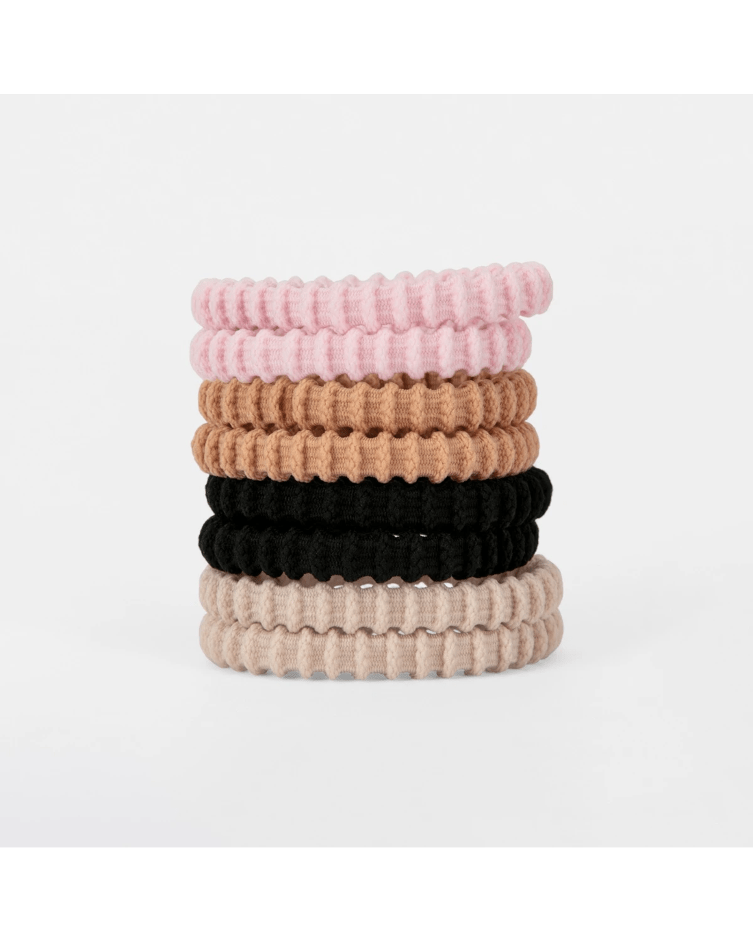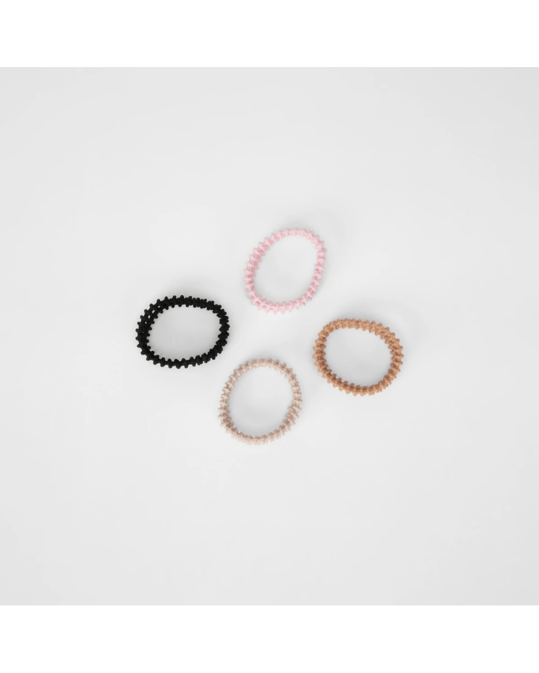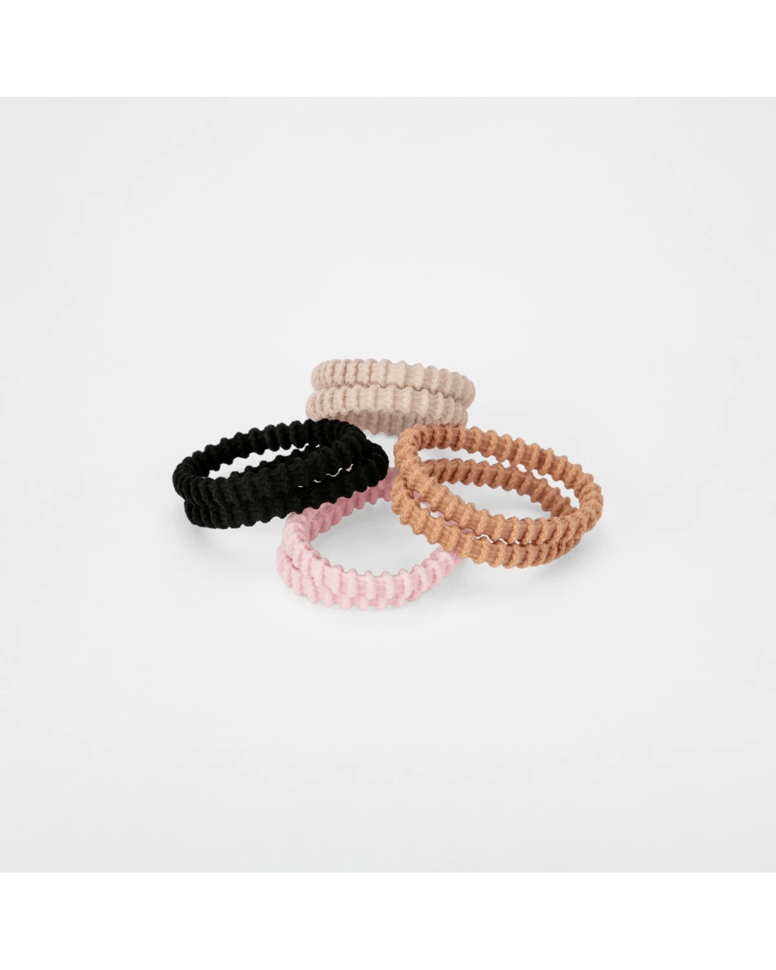 • Ribbed, elasticised hair-ties in neutral colours