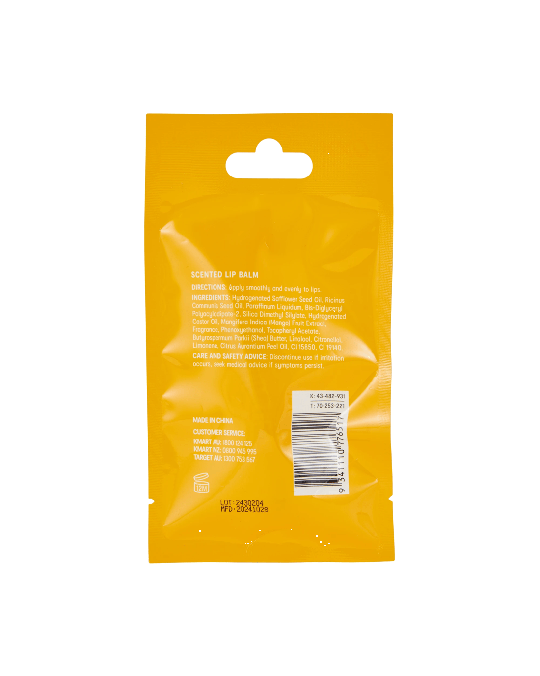 • Ingredients: Hydrogenated Safflower Seed Oil, Ricinus Communis Seed Oil, Paraffinum Liquidum, Bis-Diglyceryl Polyacyladipate-2, Silica Dimethyl Silylate, Hydrogenated Castor Oil, Mangifera Indica (Mango) Fruit Extract, Fragrance, Phenoxyethanol, Tocopheryl Acetate, Butyrospermum Parkii (Shea) Butter, Linalool, Citronellol, Limonene, Citrus Aurantium Peel Oil, CI 15850, CI 19140