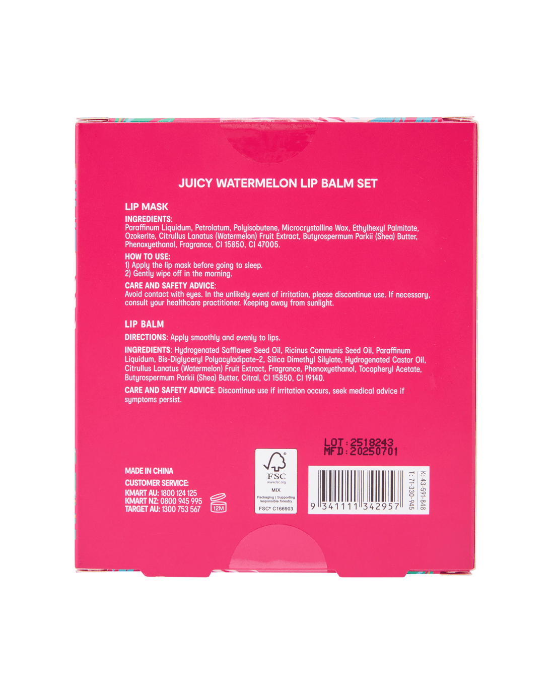 • Lip mask: Paraffinum Liquidum, Petrolatum, Polyisobutene, Microcrystalline Wax, Ethylhexyl Palmitate, Ozokerite, Citrullus Lanatus (Watermelon) Fruit Extract, Butyrospermum Parkii (Shea) Butter, Phenoxyethanol, Fragrance, CI 15850, CI 47005