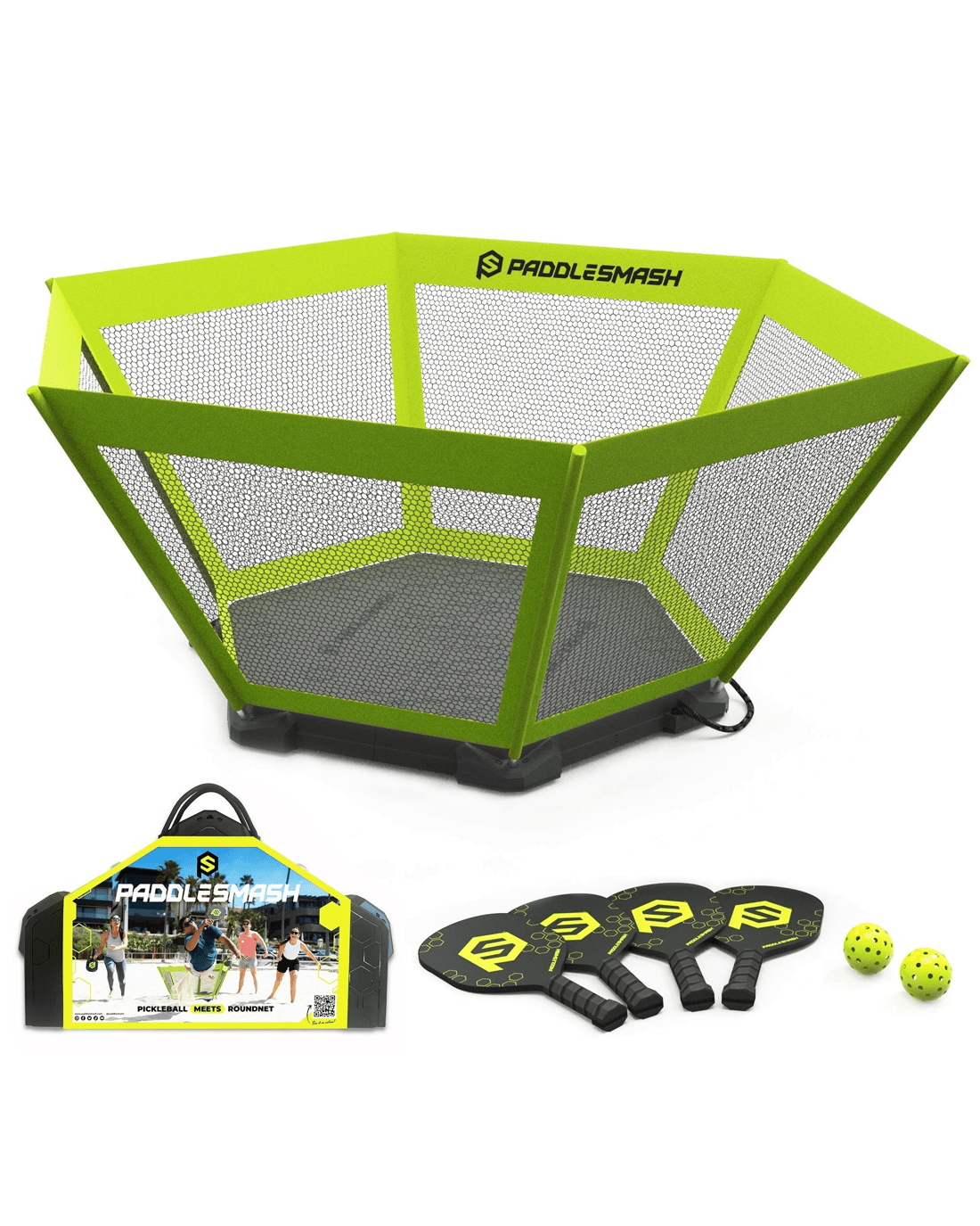 PaddleSmash is a new outdoor game that combines the best elements of Pickleball and Roundnet into a fun and easy-to-learn game that can be played anywhere.