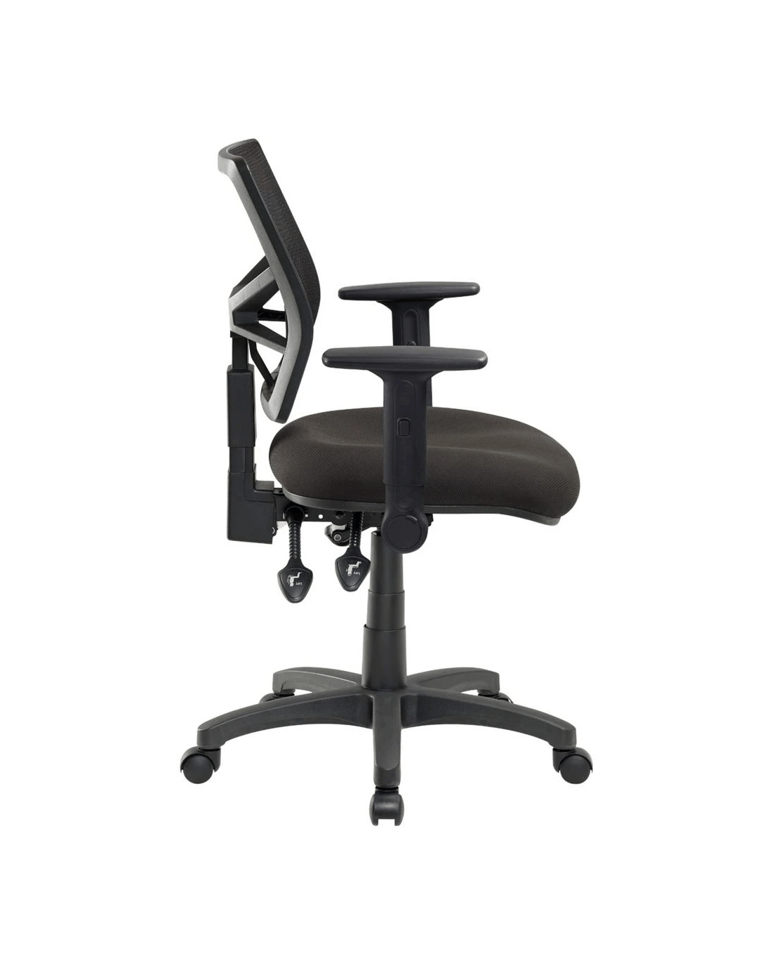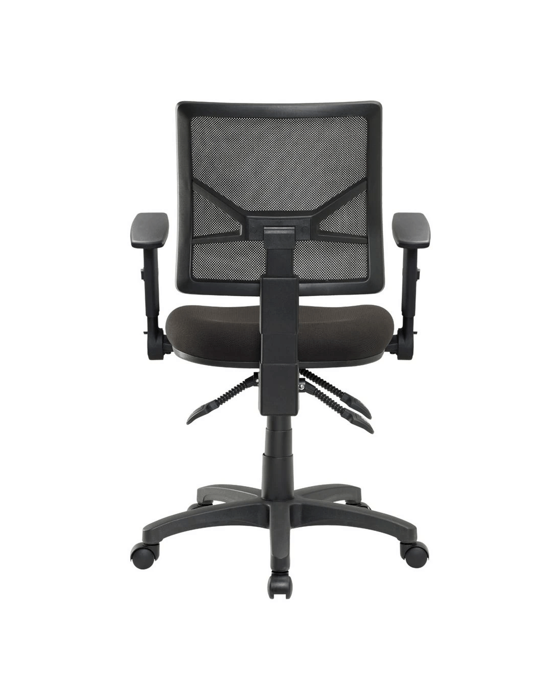 - It has an air-flow mesh back with lumbar support and an extra wide contoured moulded foam seat for all day comfort.