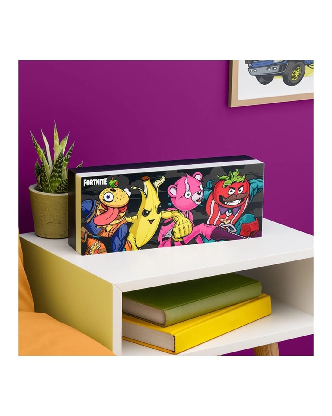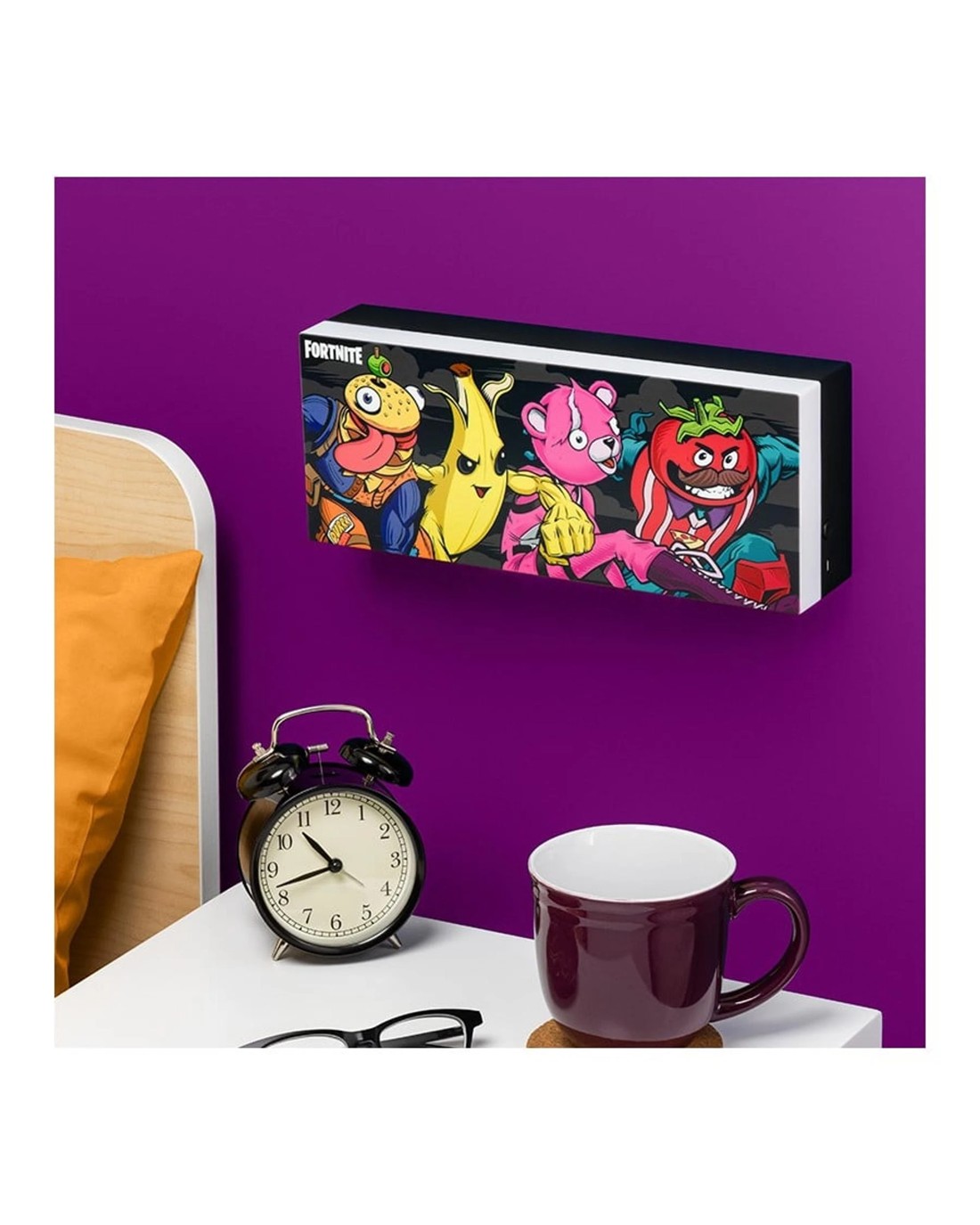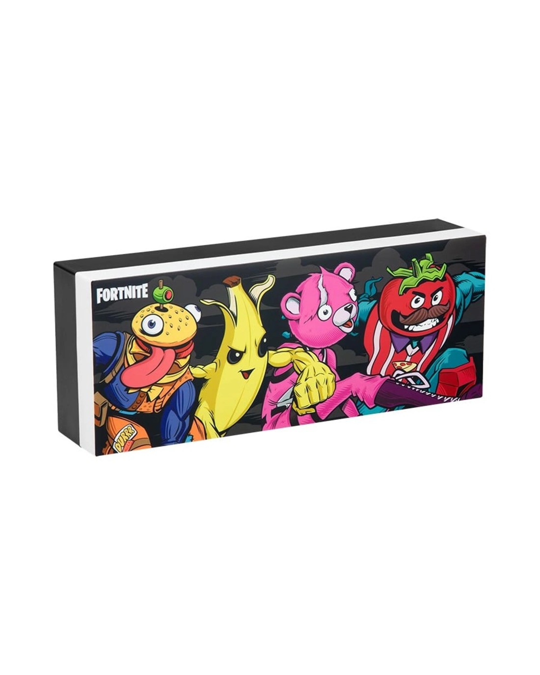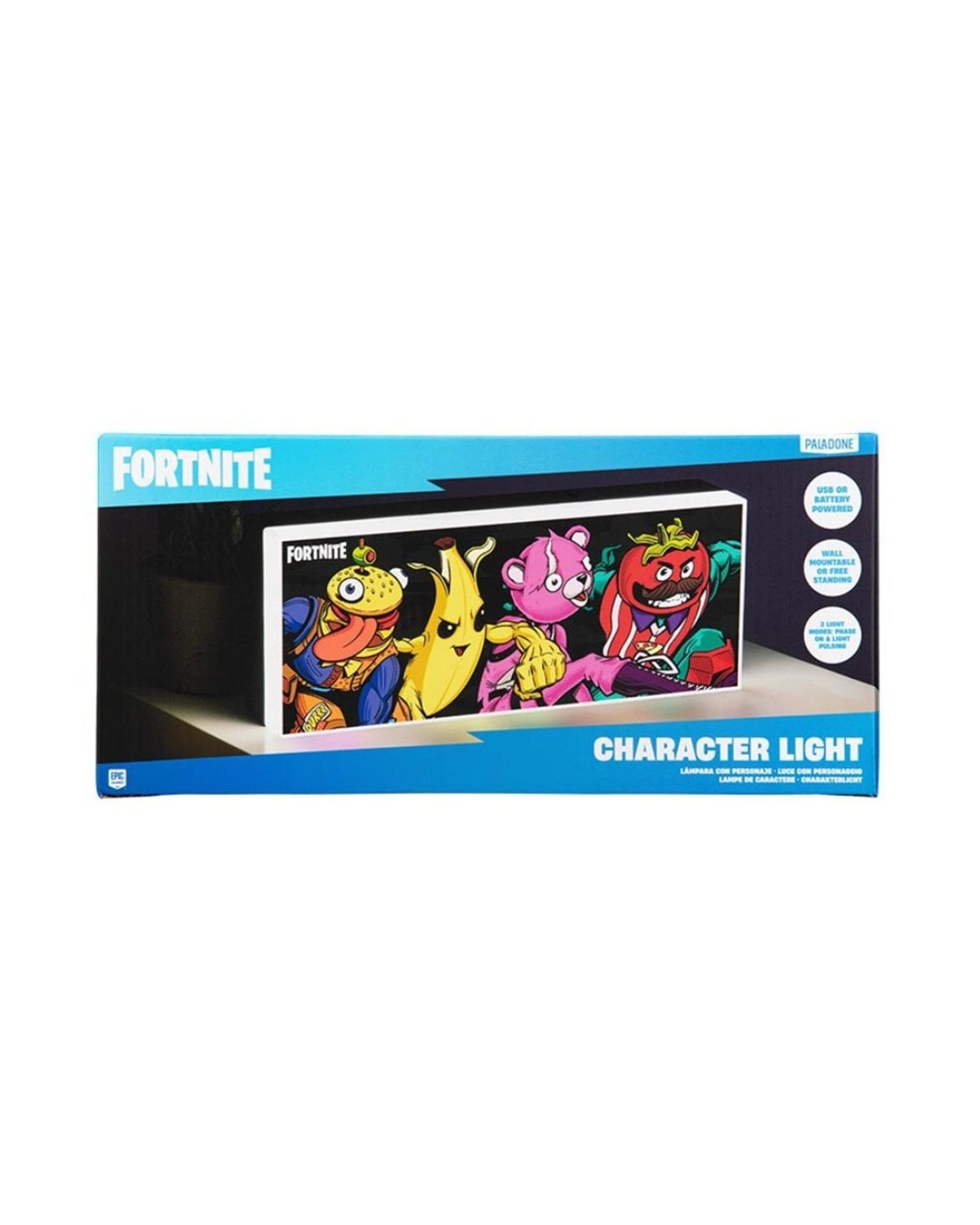 Light up your bedroom with this Fortnite Character Light. Features two light settings to choose from - phase on and light pulsing mode.The 30cm wide wall-mountable light perfectly captures the fun of the game. It includes designs of the popular skins Peely, Beef Boss, Tomotohead and Cuddle Team Leader.Power your light with the USB cable (included) or 3x AAA batteries (not included).The Fortnite Character Light is great for adding a little Battle Royale fun to any room.