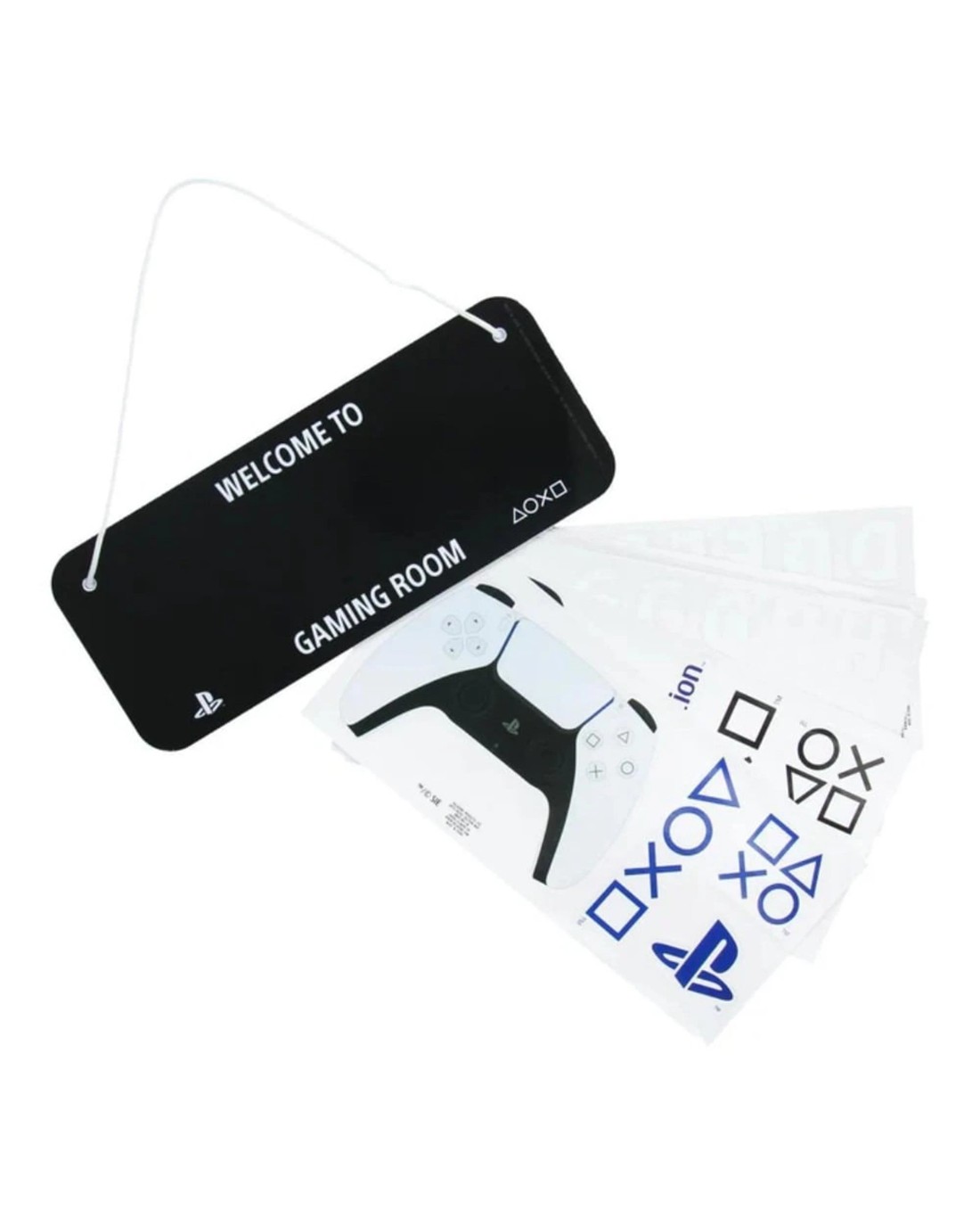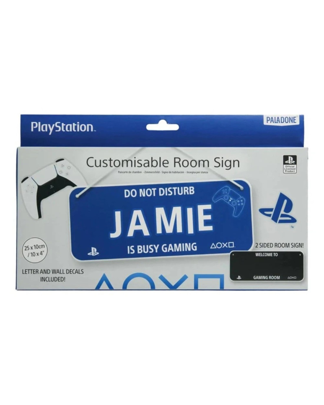 Add a personal touch to your bedroom door or gaming room with this PlayStation Customisable Room Sign Set. The set comes with a 25cm by 10cm double-sided plastic sign, a white string and decals. Use the decal stickers to add your name or your child's name to make it truly unique and special. The PlayStation Customisable Room Sign Set is the perfect gift for any console gamer.