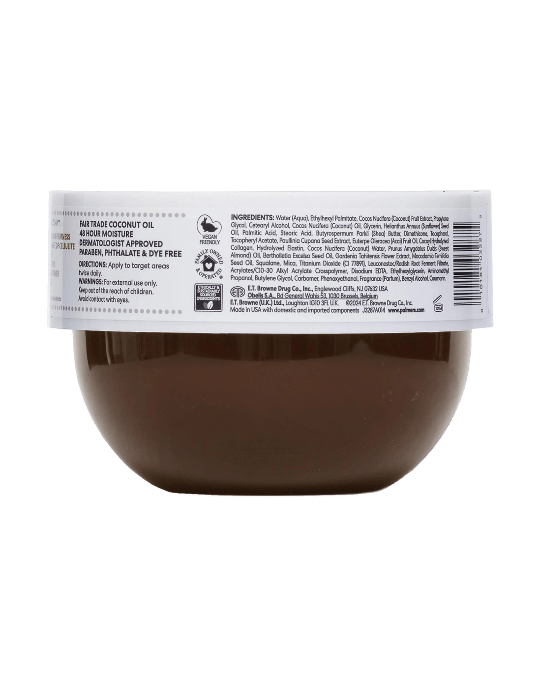 Ingredients: Water (Aqua), Ethylhexyl Palmitate, Cocoa Nucifera (Coconut) Fruit Extract, Propylene Glycol, Cetearyl Alcohol, Cocos Nucifera (Coconut) Oil, Glycerin, Helianthus Annuus (Sunflower) Seed Oil, Palmitic Acid, Stearic Acid, Butyrospermum Parkii (Shea) Butter, Dimethicone, Tocopherol, Tocopheryl Acetate, Paullinia Cupana (Guarana) Seed Extract, Euterpe Oleracea (Acai) Fruit Oil, Cocoyl Hydrolyzed Collagen, Hydrolyzed Elastin, Cocoa Nucifera (Coconut) Water, Prunus Amygdalus Dulcis (Sweet Almond) Oil, Bertholletia Excelsa Seed Oil, Gardenia Tahitensis Flower Extract, Macadamia Ternifolia Seed Oil, Squalane, Mica, Titanium Dioxide (CI 77891), Leuconostoc/Radish Root Ferment Filtrate, Acrylates/C10-30 Alkyl Acrylate Crosspolymer, Disodium EDTA, Ethylhexylglycerin, Aminomethyl Propanol, Butylene Glycol, Carbomer, Phenoxyethanol, Fragrance (Parfum), Benzyl Alcohol and Coumarin