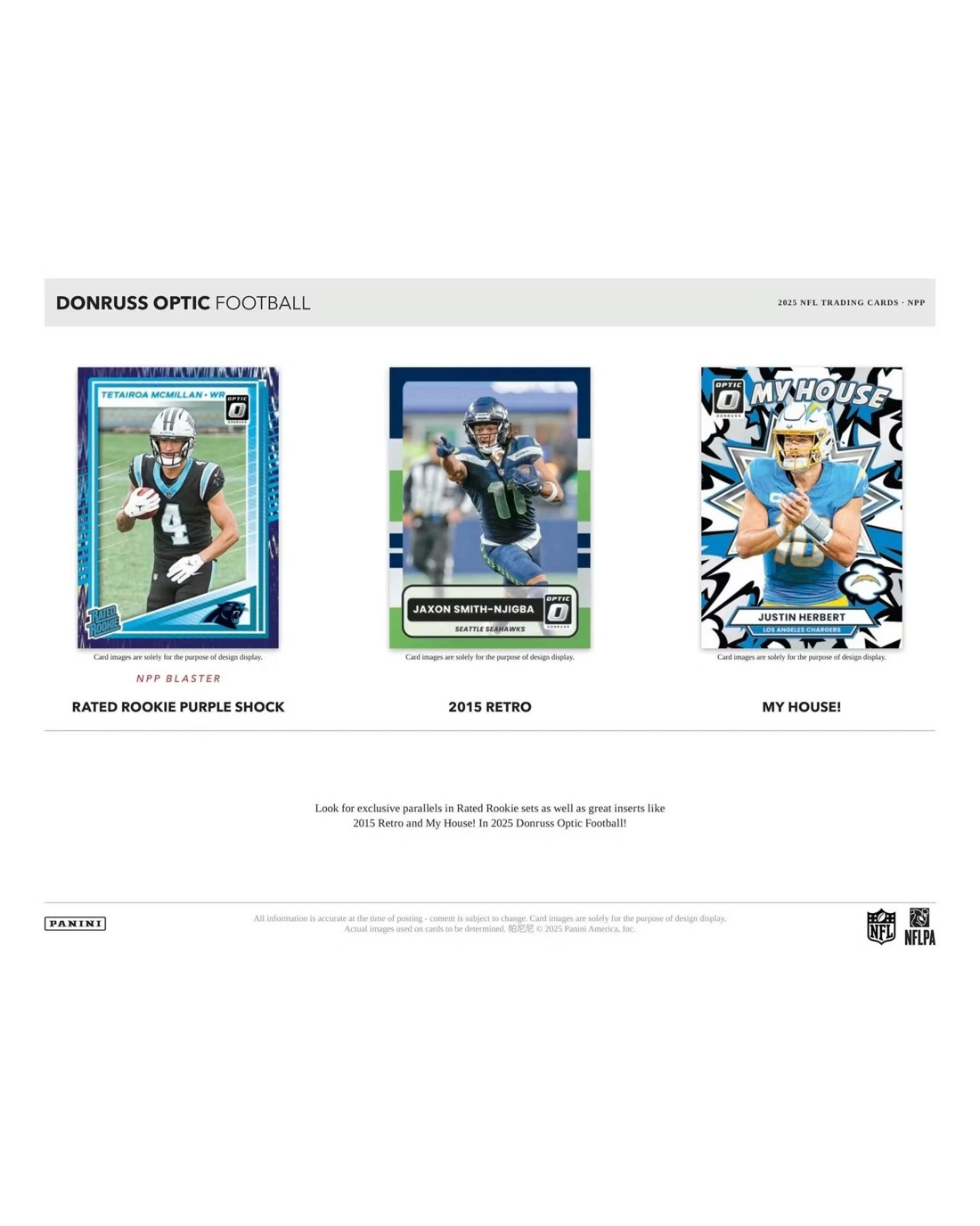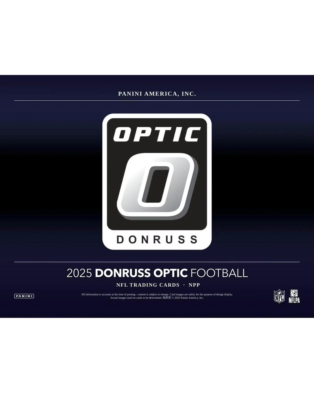 Look For Autographs! Search For Memorabilia Cards! Find SSP Downtown Inserts! Search For Rookie Kings Inserts! Find Blaster Exclusive Purple Shock Parallels! Cam Ward Travis Hunter Ashton Jeanty Jaxson Dart Shedeur Sanders Abdul Carter Tetairoa McMillan Colston Loveland Omarion Hampton Tyler Warren Emeka Egbuka Matthew Golden The collecting staple that is Donruss Football meets Optichrome technology once again in 2025 to create the fan-favorite Donruss Optic Football! Find Ultra-Rare, highly sought-after Downtowns! Look for Purple Shock parallels, only found in NPP Exclusive Blaster! 2025 Donruss Optic Football features a great insert lineup, including Sunday Kings, Downtown and Rookie Kings! Look for exclusive parallels in Rated Rookie sets as well as great inserts like 2015 Retro and My House! In 2025 Donruss Optic Football!