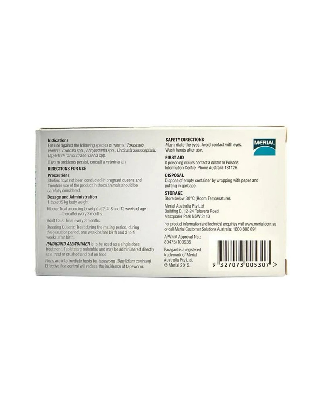 Paragard Allwormer is a broad-spectrum worming treatment that protects your cat against all major intestinal worms, including roundworm, hookworm, and tapeworm. Each tablet treats 5 kg of body weight and provides effective control to keep your cat healthy and parasite-free.