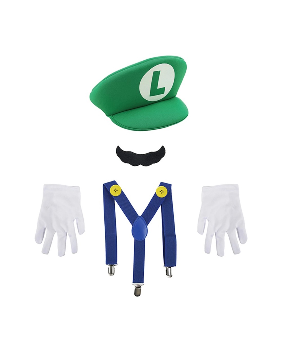 Green Super Plumber Kids Costume Kit. Cap, gloves, suspenders and moustache for a Super Mario Bros. party.