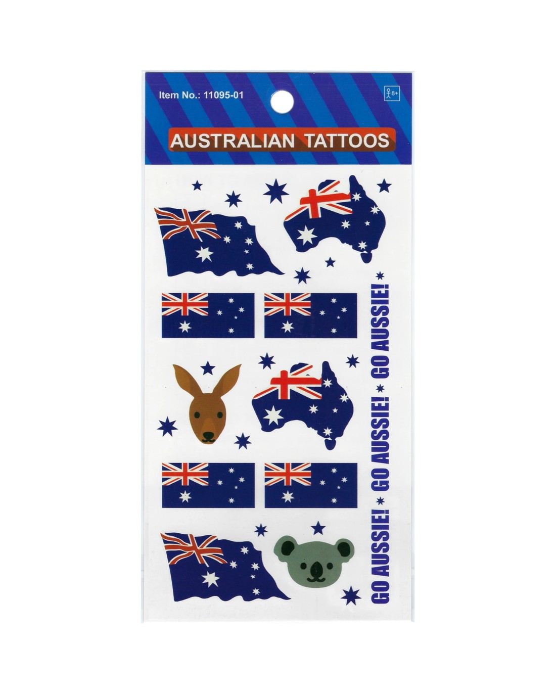 Aussie, Aussie, oi, oi! Show some Aussie spirit at your Australian themed party or Australian themed sporting event with this fun mix of Australian flag, kangaroo and koala tattoos!