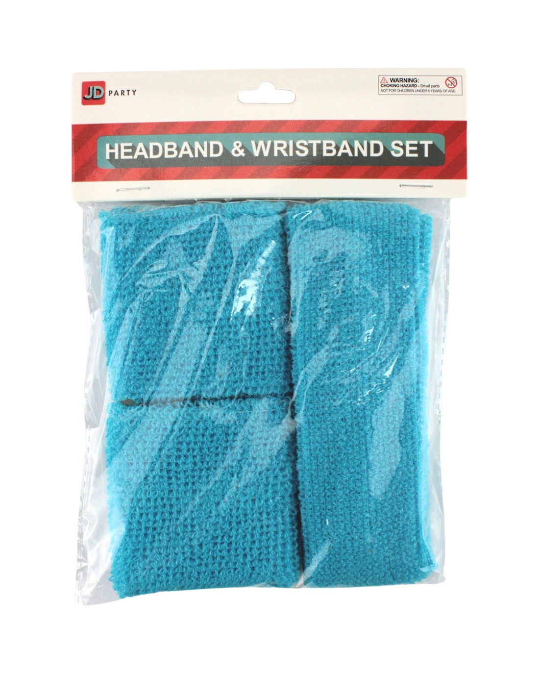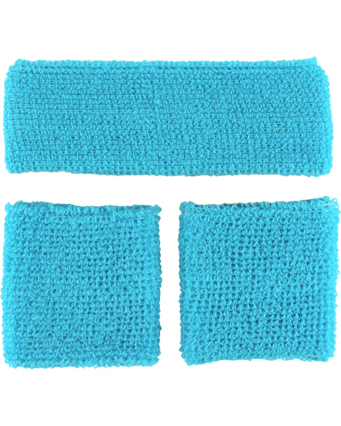 Bright Blue Sweatband Set. Terry towelling wristbands and headband set for a retro Tennis or 80's party.