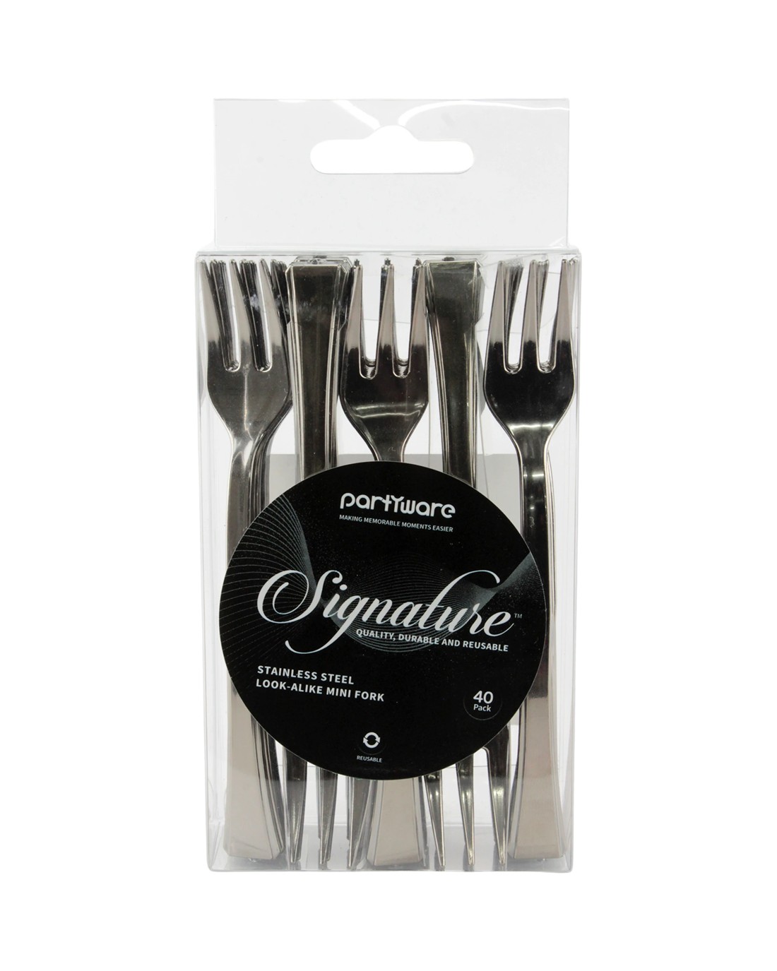 Partyware Stainless Steel Look Reusable Plastic Mini Cocktail Forks Pack of 40 - Silver