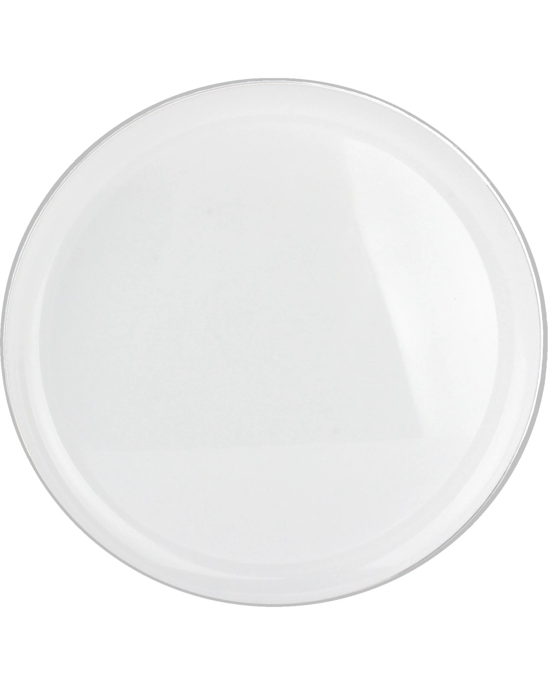 Pack of 10 White With Silver Trim Plastic Plates. White dinner plates with a silver rim.