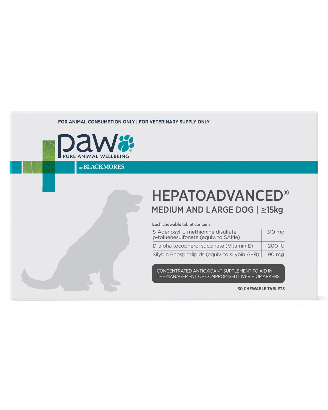 PAW Hepatoadvanced is a concentrated antioxidant supplement designed to support liver health in cats and dogs. Its unique blend of antioxidants and hepatoprotective ingredients has been scientifically shown to improve biomarkers in pets with acute or chronic liver disease.