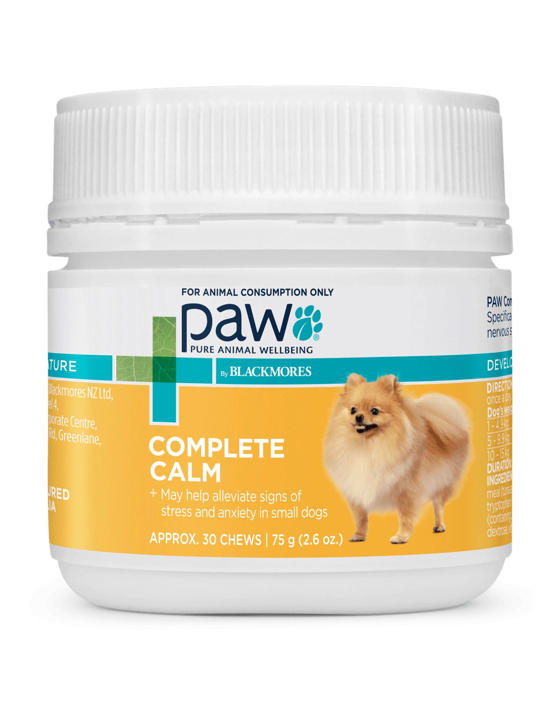 "PAW Complete Calm Chews for Small Dogs are soft, tasty chews designed to support the nervous system and may help reduce signs of anxiety, including aggression.