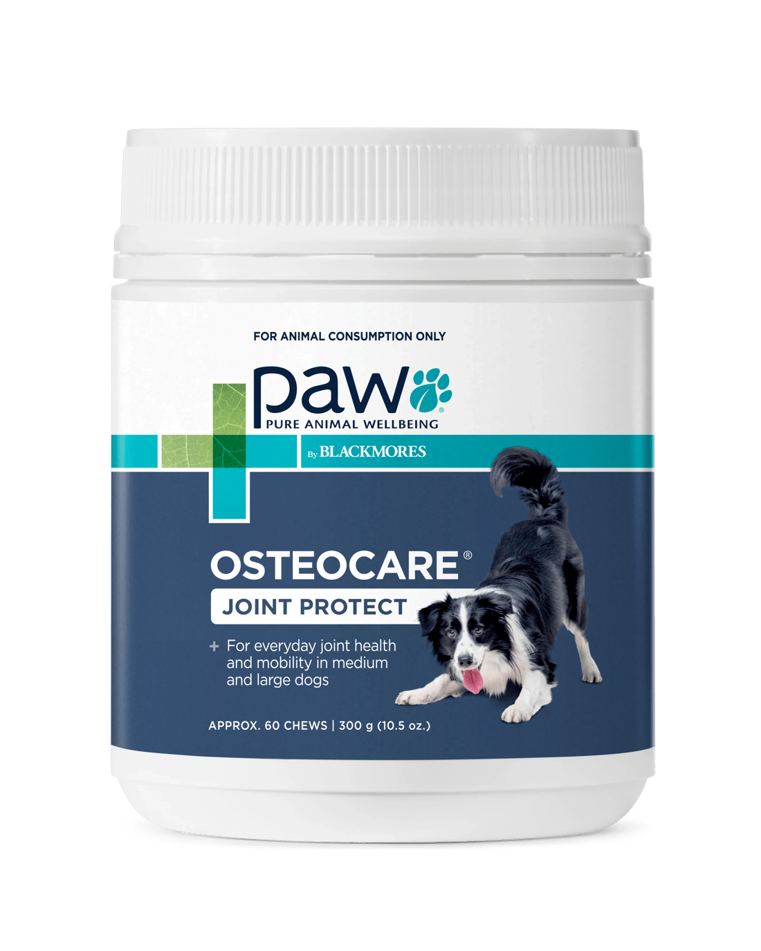 "PAW Osteocare Joint Care Chews Tasty kangaroo chews with Glucosamine Sulfate and Chondroitin Sulfate to support joint function and health in dogs of all ages. Suitable for younger dogs for long-term joint support and older dogs with existing joint concerns.