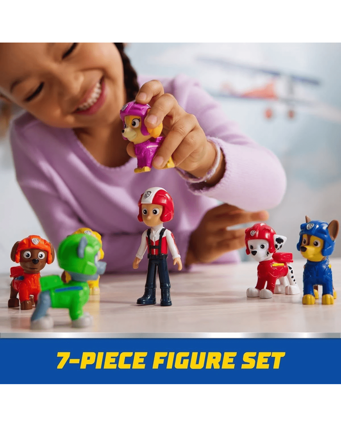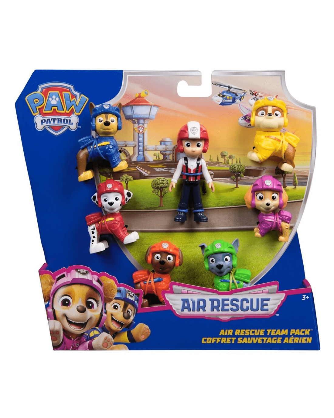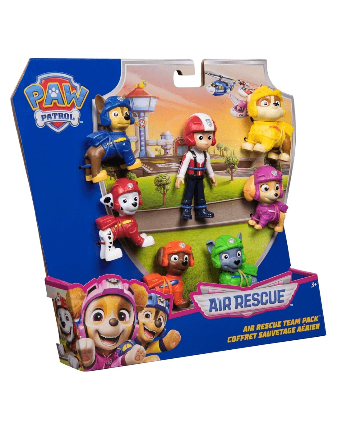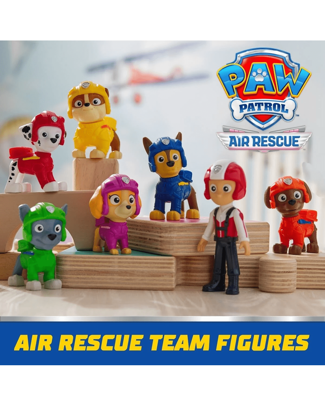 Create your own PAW Patrol Air Rescue adventures with this awesome PAW Patrol Collectible Figure Gift Pack! This PAW Patrol toy figures set includes seven collectible toy figures, Chase, Ryder, Marshall, Rocky, Rubble, Zuma and Skye, decked out in their all-new Air Rescue flight jackets and helmets so that each figure looks just like they do in the show! Each pup is over 5cm tall, with movable heads, while Ryder stands 9cm tall and has a poseable head and arms, making them a must-have for PAW Patrol toy collectors! PAW Patrol preschool toys and toddler learning toys are gifts for kids who are fans of the show, fostering imaginative pretend play and enhanced fine motor skills. Relive your favourite moments from PAW Patrol seasons, like the Mighty Pups and PAW Patrol Movie, then create your own adventures with the PAW Patrol pups and their respective toy cars (each sold separately). Elevate the excitement with the complete Action Pups and Air Rescue team sets, which include PAW Patrol vehicles, action figures and toddler toys, for endless hours of PAWsome, series-inspired adventures!