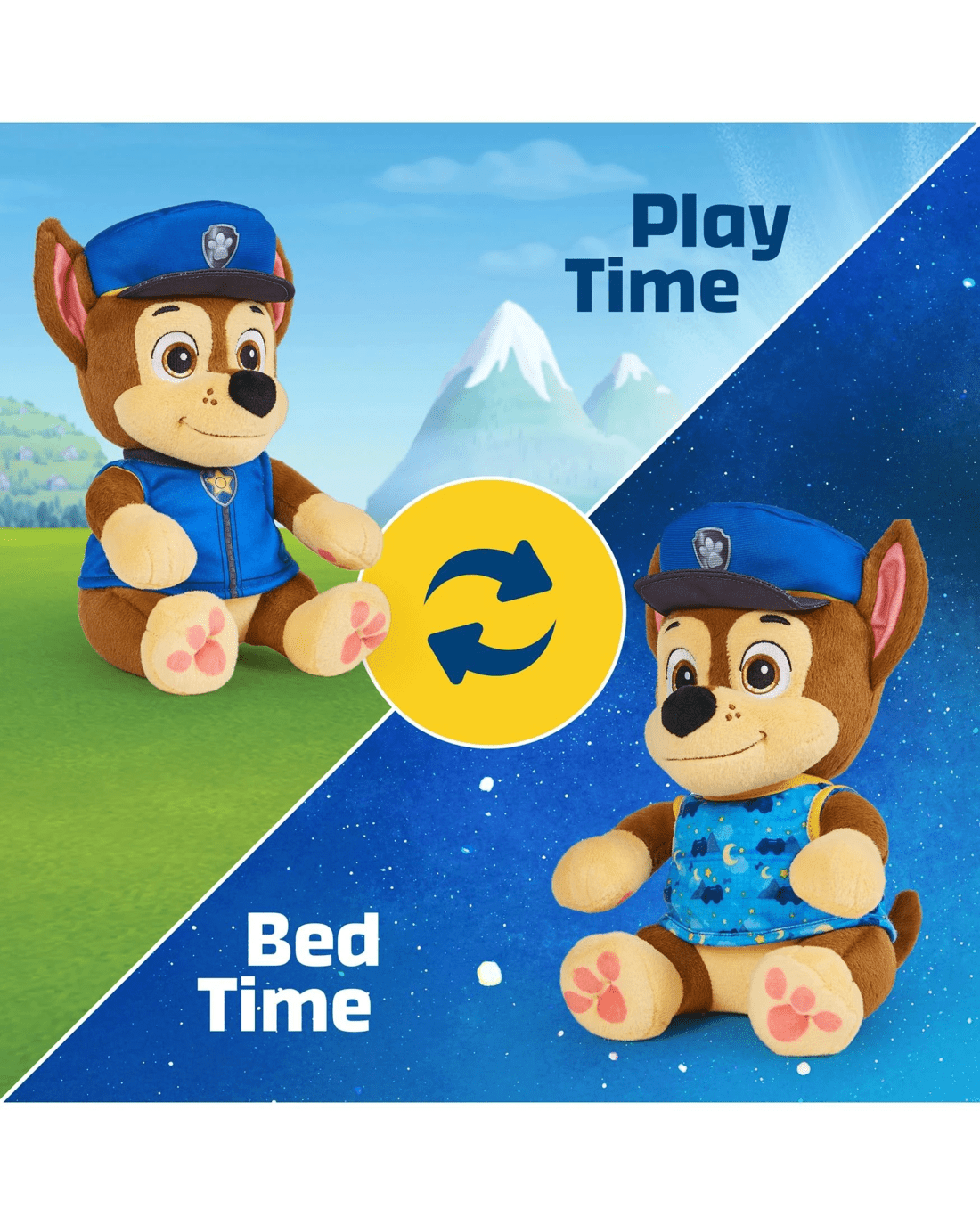 - REVERSIBLE OUTFIT: Chase and Skye are dressed in their signature pilot uniform and a cute hat. Change her into their adorable pajamas at bed time, by undoing the Velcro & flipping their uniform inside out!