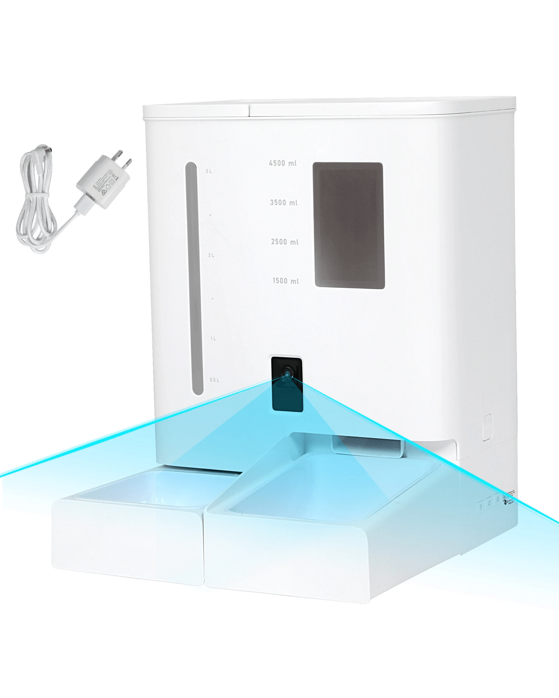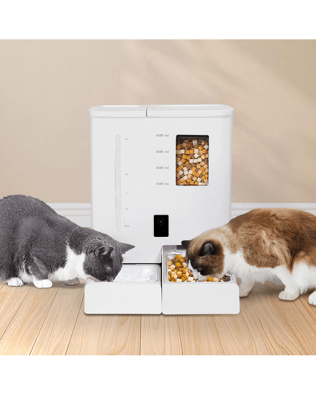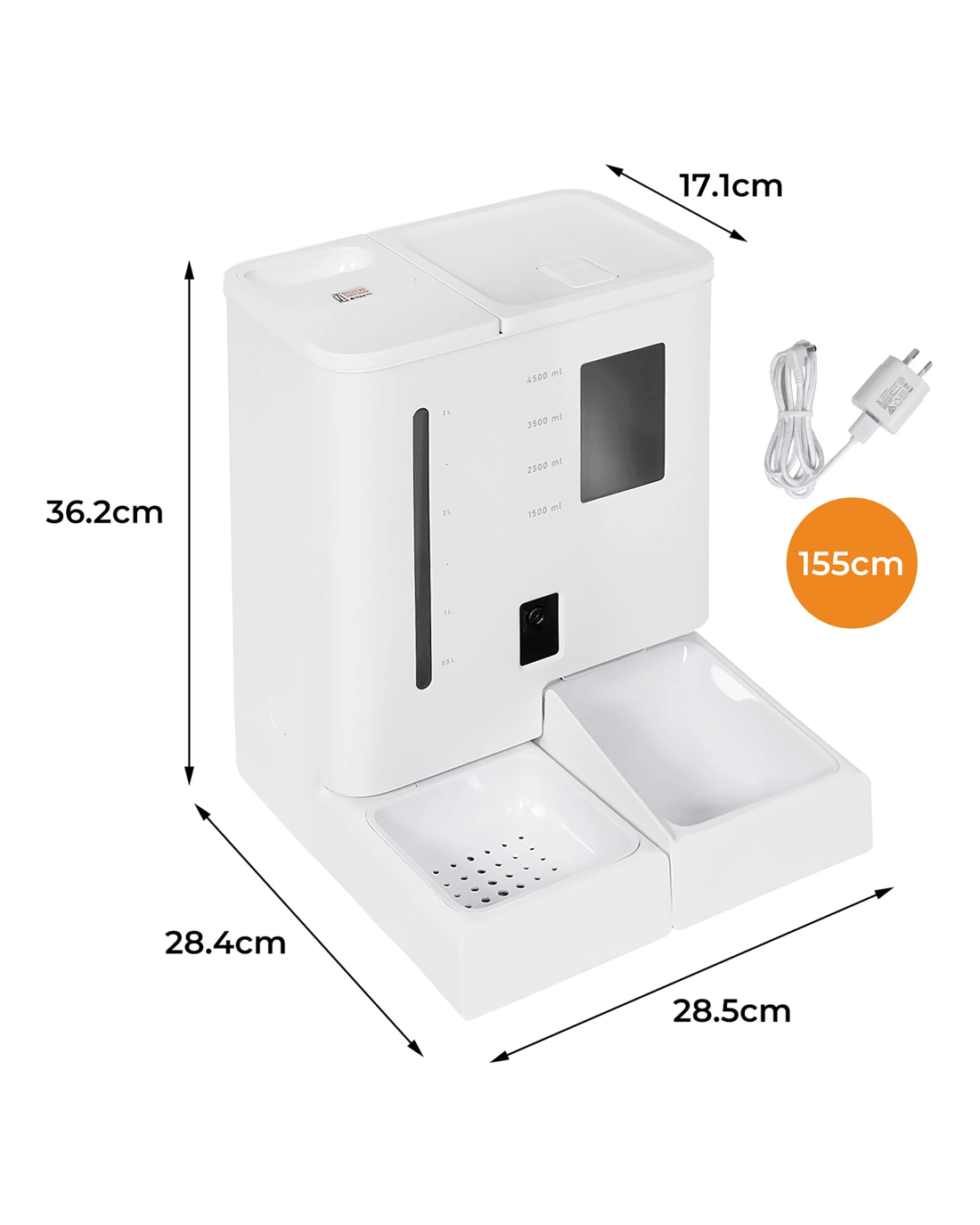 The Pawz 2-in-1 Automatic Pet Feeder & Waterer is the ultimate solution for modern pet care, combining convenience, innovation, and reliability to simplify your daily routine. With its dual design, it features a 4L food storage compartment and a 5L water tank, ensuring your pets stay well-fed and hydrated at all times. Equipped with remote WiFi app control, you can easily manage feeding schedules from anywhere using the free app, compatible with both iPhone and Android smartphones. The flexible feeding function allows you to customize portion sizes and meal times to suit your pet's unique needs, while the 10-second audio recording feature lets you call your pets with a personalized message.