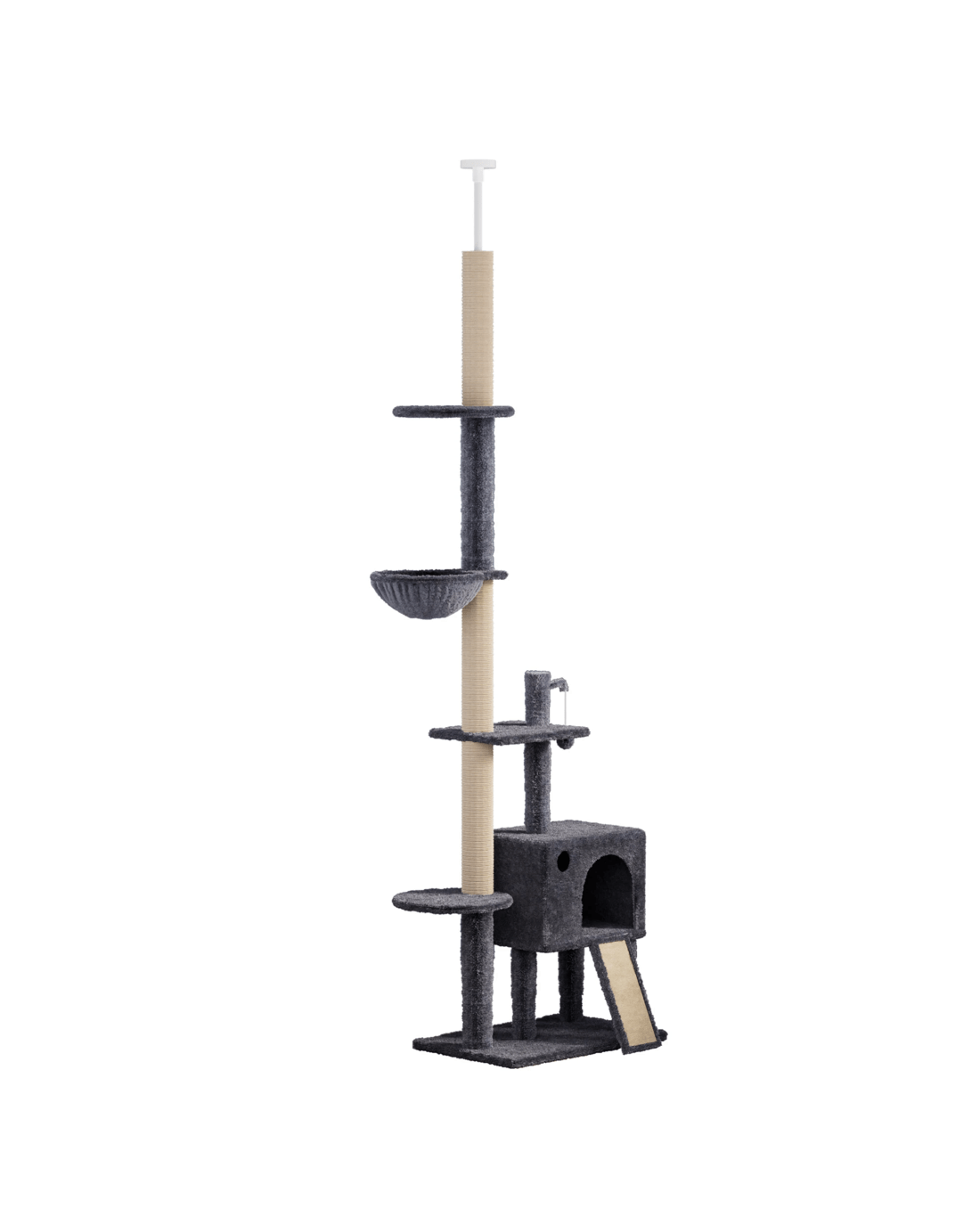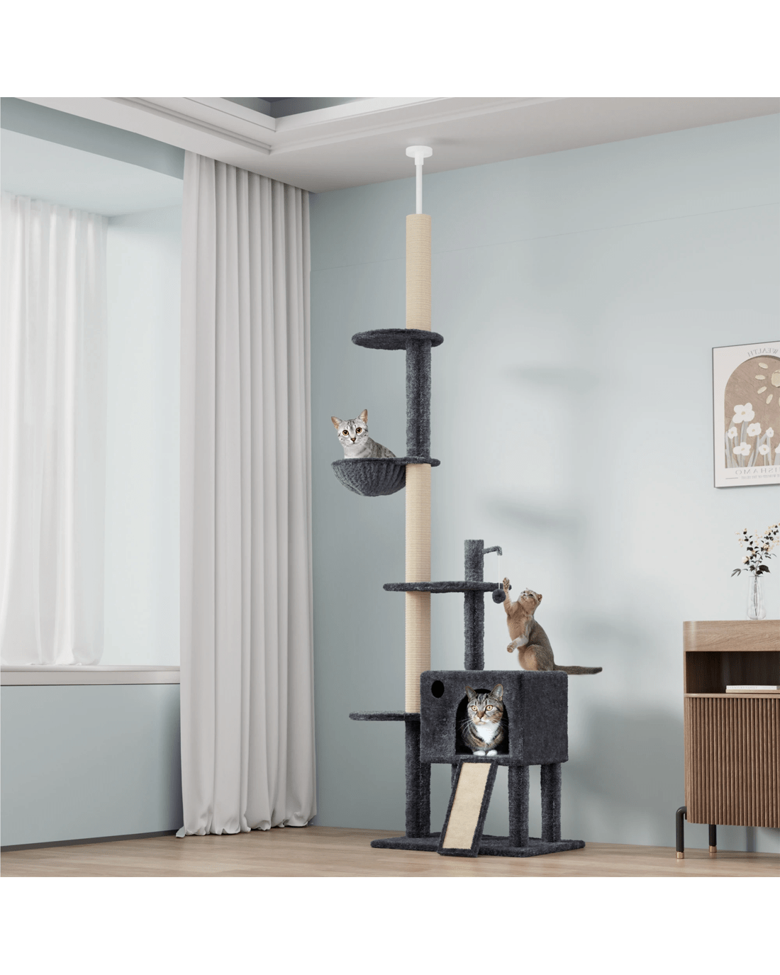 This floor-to-ceiling cat tree is a perfect space-saving solution, offering six levels for your cat to climb, jump, and rest. The multi-platform design maximizes vertical space, giving your cat the freedom to move, explore, and stay entertained with plenty of opportunities for interactive play.