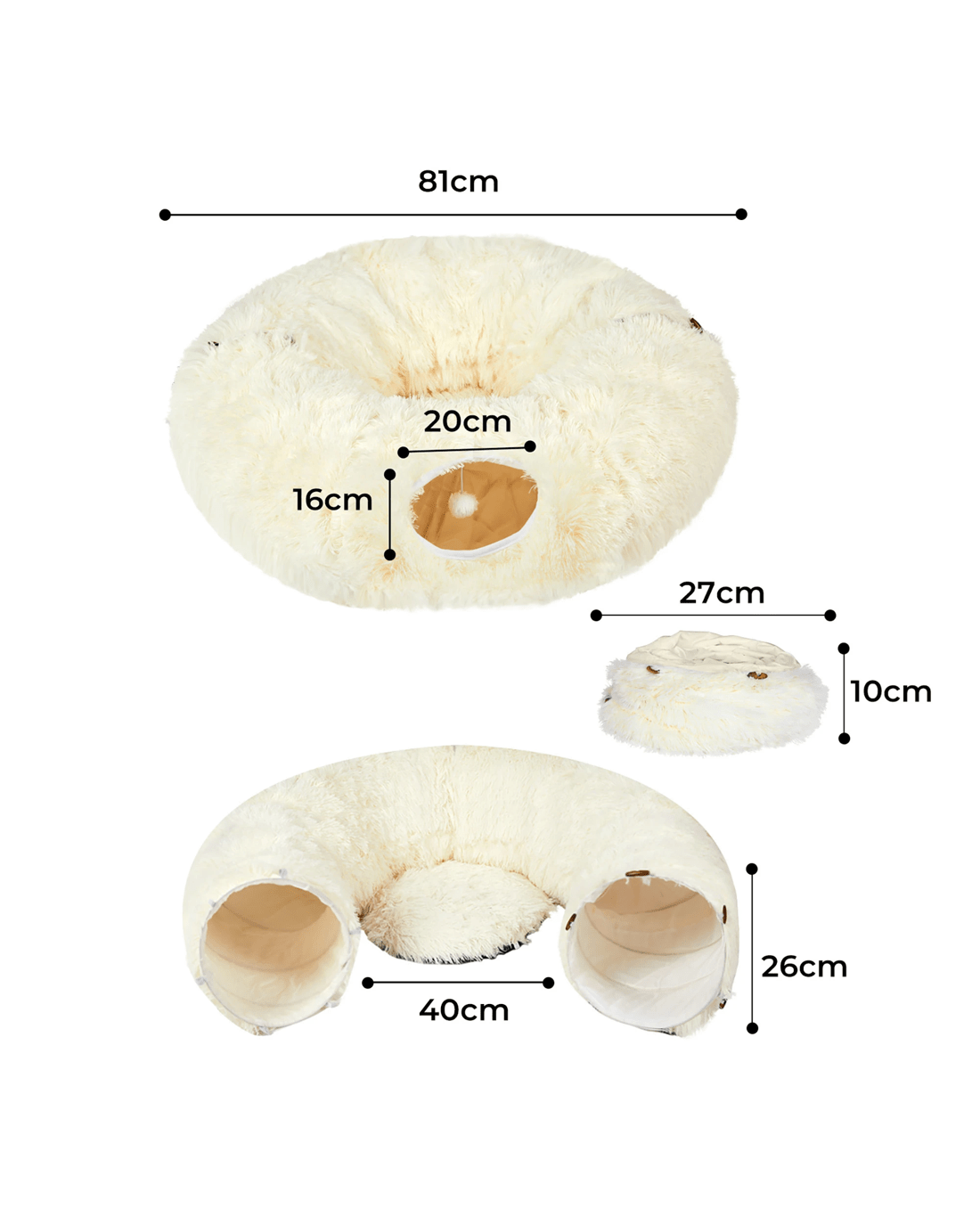 Your cat can crawl inside or lie down on it. This multi-purpose bed satisfies your cat's natural instinct to burrow. It's not just a bed; it's a haven for your pet. The entire bed is detachable, unlocking a variety of play methods. Your cat can explore and have fun in different ways. And there's more! The entrance of the tunnel bed is decorated with a pom-pom toy, a real teasing artifact for your cat.