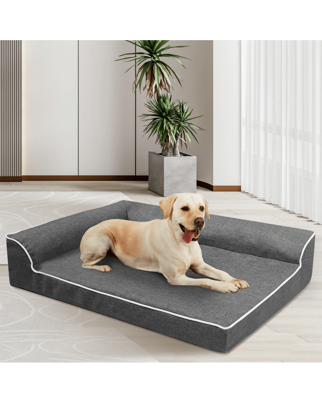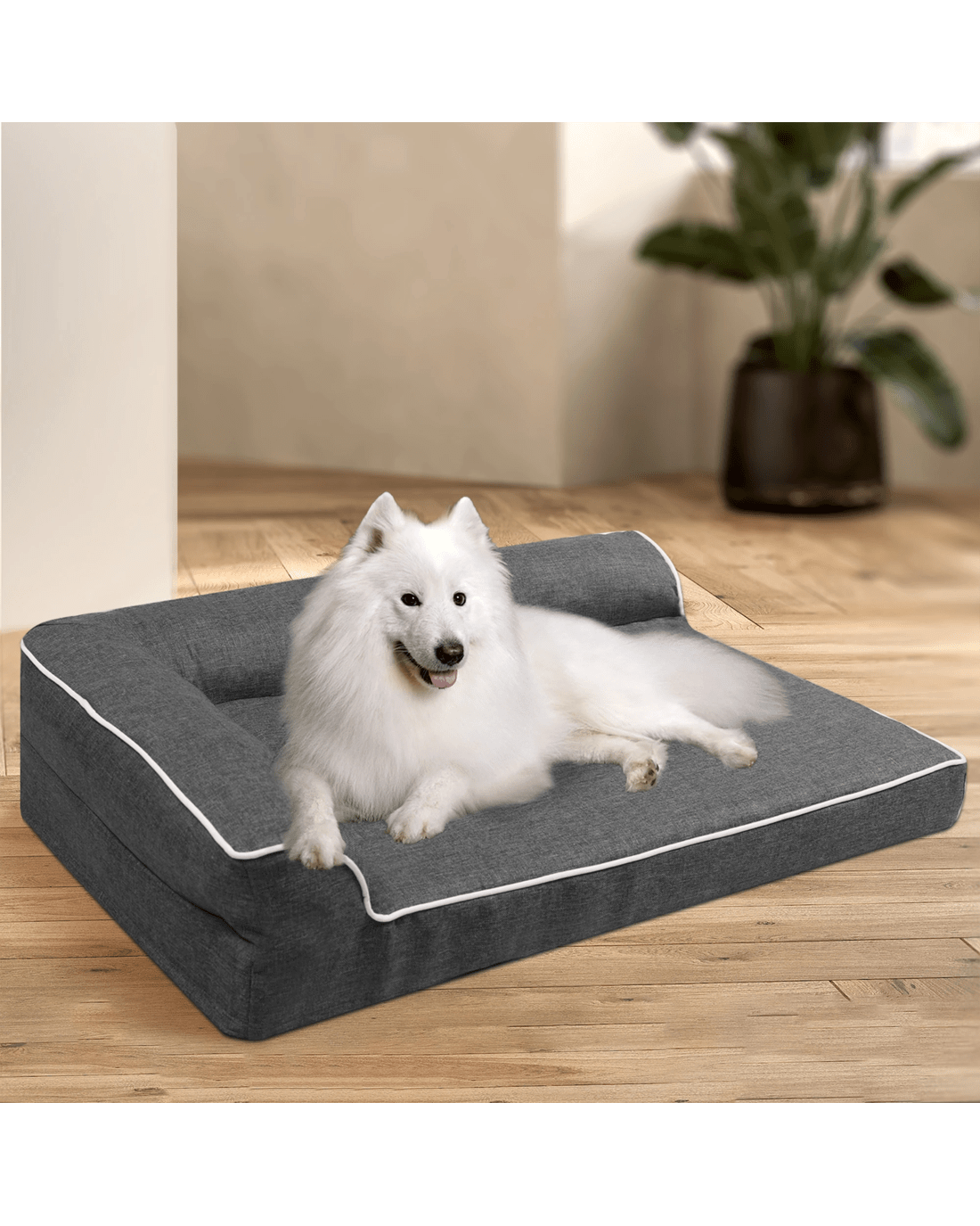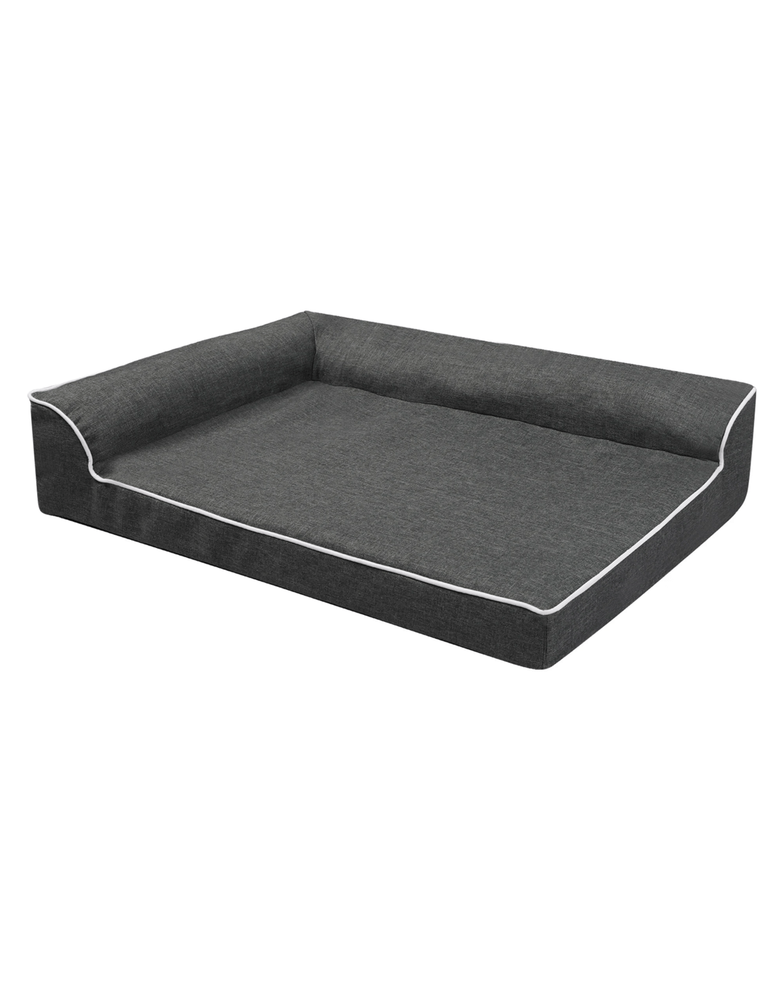 The unique L-shaped bolster sofa bed design offers additional support for your pet's neck and head, promoting deep, restorative sleep. The surrounding bolsters not only provide a sense of security but also allow your pet to snuggle comfortably and relax fully.
